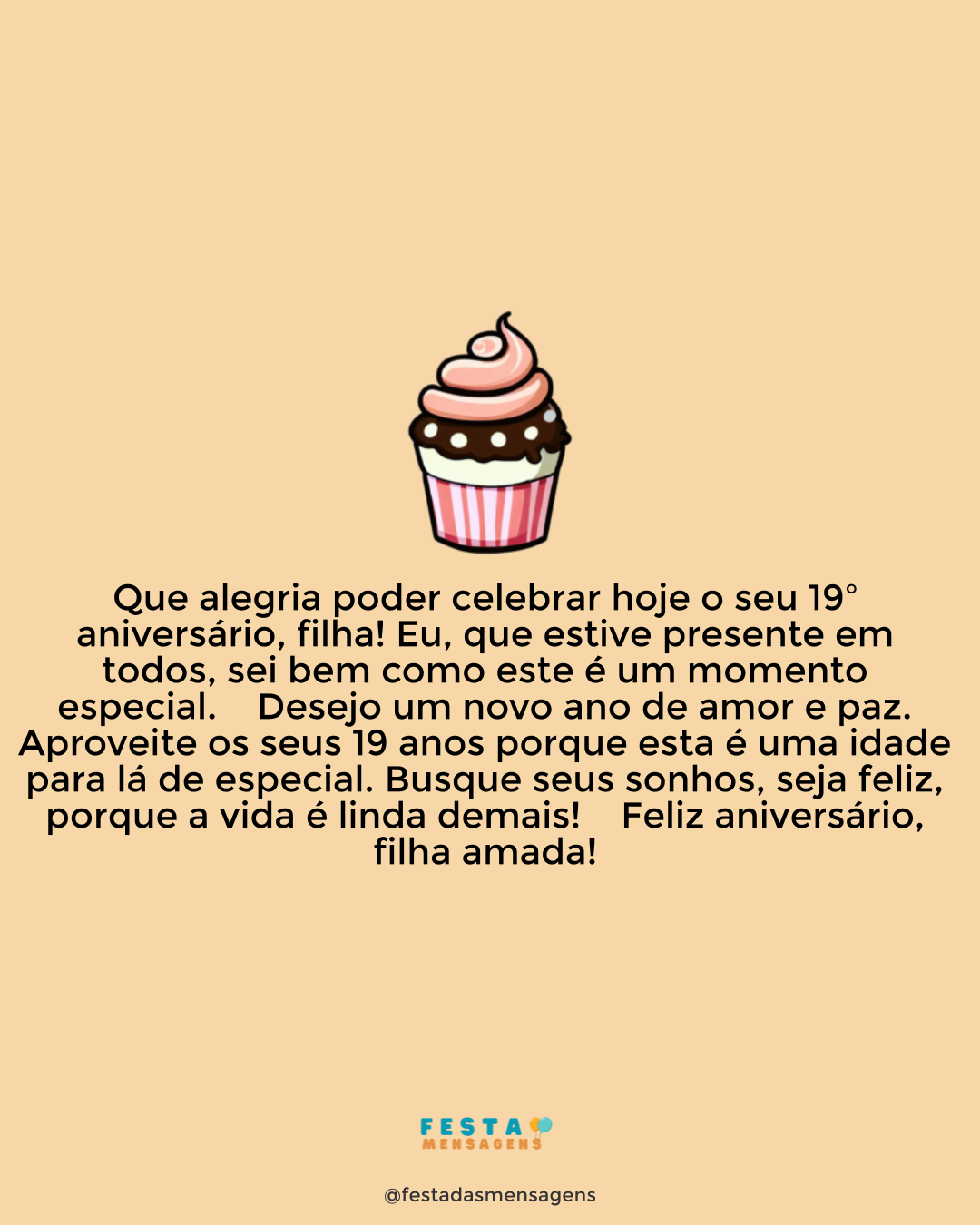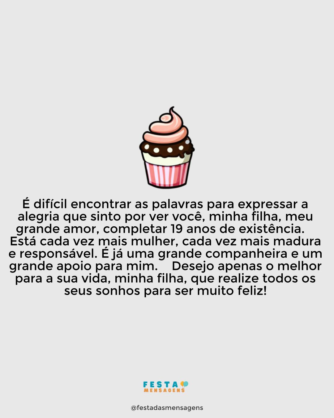Fazer 15 anos é um momento especial na vida de qualquer rapariga, pois começa a dar os primeiros passos para se tornar uma mulher. Você cresceu muito, minha filha, e, sem sombra de dúvida, se está tornando uma mulherzinha, mas aos olhos do papai você será sempre aquela menina a quem pegava no colo e que é a luz da minha vida. Quando olho para você, só encontro motivos para agradecer a Deus por me ter dado uma filha adorável que eu tanto amo e a quem desejo o melhor que há neste mundo. Espero que um dia realize todos os seus sonhos! Feliz aniversário, querida filha!