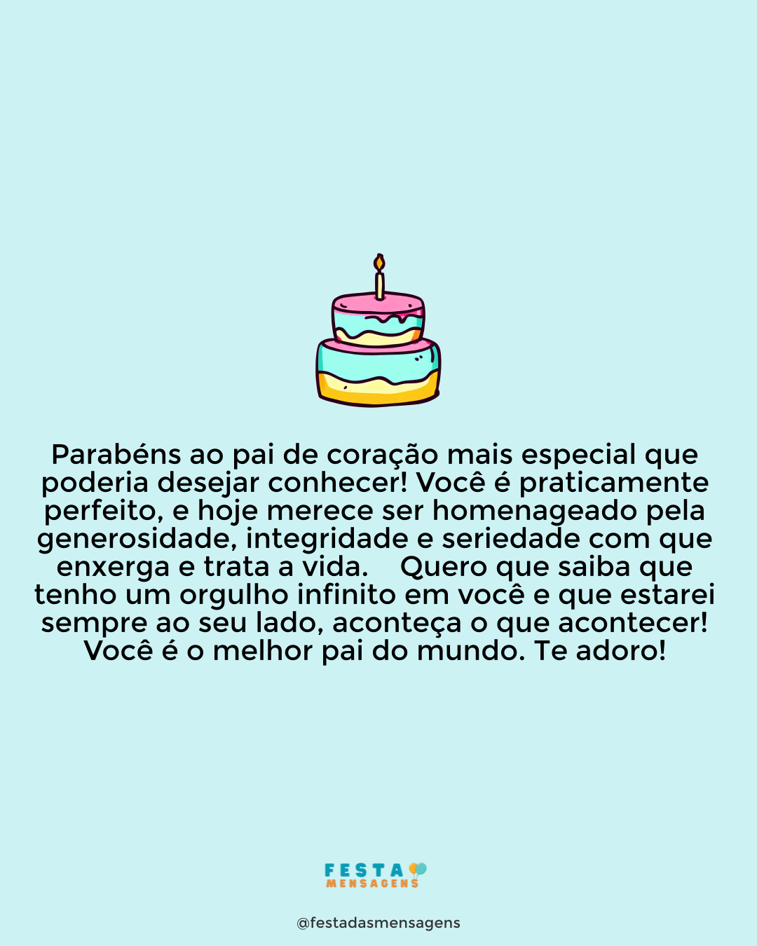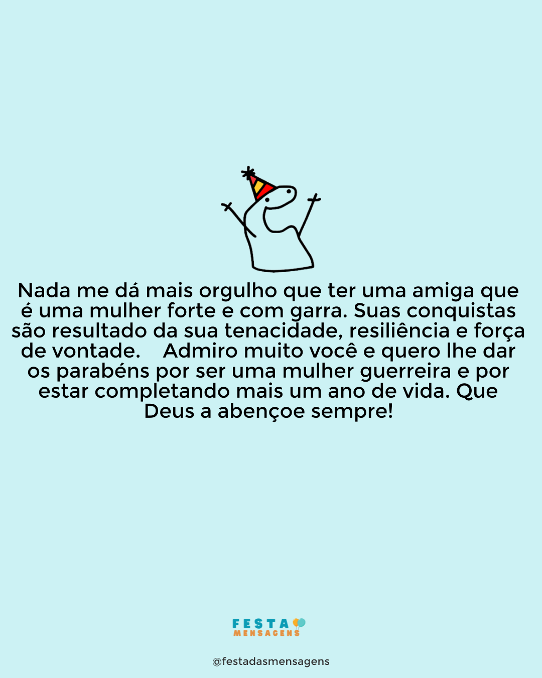 Minha maravilhosa mãe, hoje você completa mais um ano de vida, mas não há presente no mundo que possa igualar tudo aquilo que você já me deu. Todos os dias me esforço por ser a filha que você merece, e lhe peço perdão por todos os momentos em que falhei. Você merece ser feliz, hoje e sempre, e esse é um dos meus objetivos principais. Sei que você se sacrificou por mim, e sempre me colocou em primeiro lugar na sua vida. Pois agora é minha vez de retribuir tudo que você fez por mim. Amo muito você, minha mãe, e tenho muito orgulho de ser sua filha. Espero que Deus abençoe este seu dia e que lhe conceda muitos anos de vida felizes. Parabéns, mamãe!