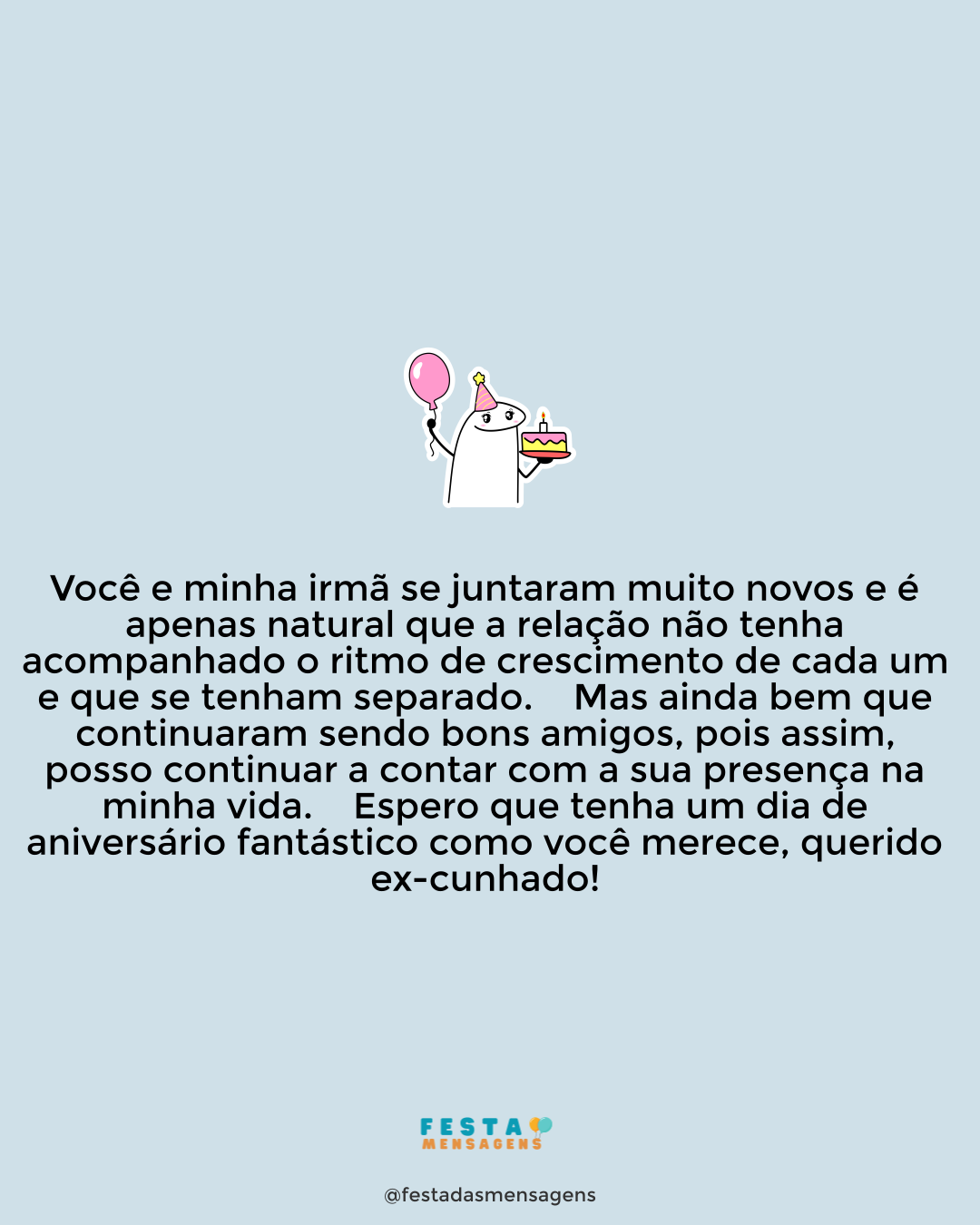 Parabéns, cunhado! Acho que nunca lhe disse isso, mas você foi uma grande aquisição para a nossa família. Os meus pais têm um orgulho em você, como se fosse filho deles. Os meus filhos te adoram, você é o tio mais legal que eles poderiam ter tido. E seus filhos olham para você com tanto respeito e admiração, como se você fosse um super-herói. A minha irmã venera você e todos podemos ver que você a ama muito. Já eu, considero você meu irmão. Você é quase perfeito, mas poderia mudar num pequeno aspeto, você podia ser um pouco menos chatinho. Feliz aniversário para o cunhadinho chatinho que é quase perfeito!