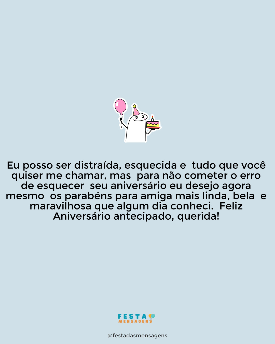 Deus quis que hoje você celebrasse mais um ano de vida, por isso desfrute intensamente desta data. Feliz Aniversário, querida! Você é uma amiga muito especial e merece tudo que existe de bom na vida. Continue atrás do que lhe traz paz, amor e alegria. E lembre-se que estarei sempre ao seu lado. Que Deus acompanhe sempre seus passos e os guie até à felicidade plena. Parabéns, amiga!