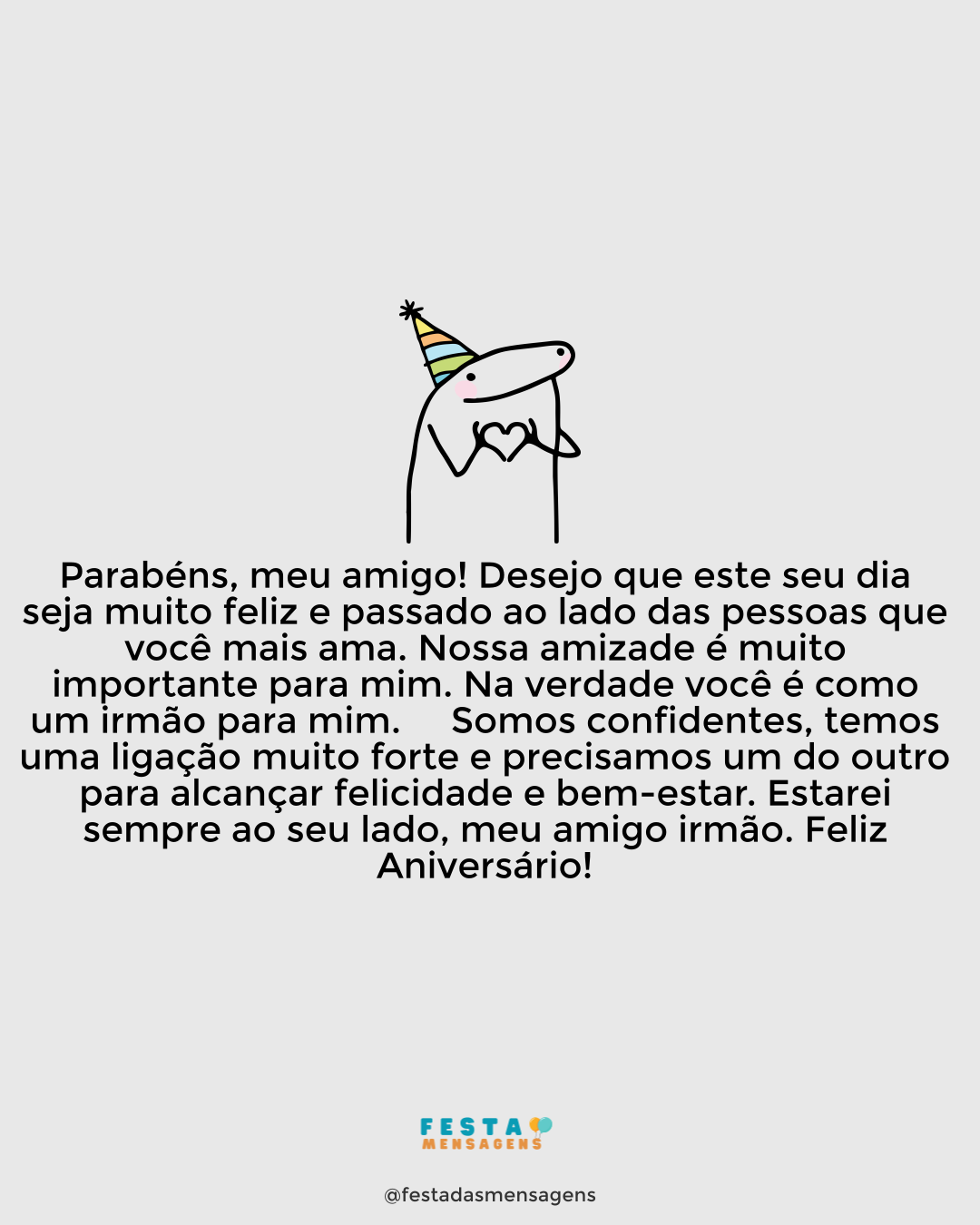 A amizade que compartilhamos é uma bênção muito especial na minha vida, e sem você sei que nada seria igual. Você é um verdadeiro amigo, especial e que eu amo como se fosse meu irmão. Feliz aniversário! Somos amigos na vida, irmãos na fé, companheiros leais que jamais se desamparam. Para mim é um privilégio fazer parte da sua vida, e que você faça parte da minha. Em especial hoje agradeço ao Senhor por ter presenteado o mundo, e em particular a mim, com uma pessoa tão única e maravilhosa quanto você. E a Ele peço também que o abençoe com uma vida muito longa e feliz. Parabéns, meu amigo!