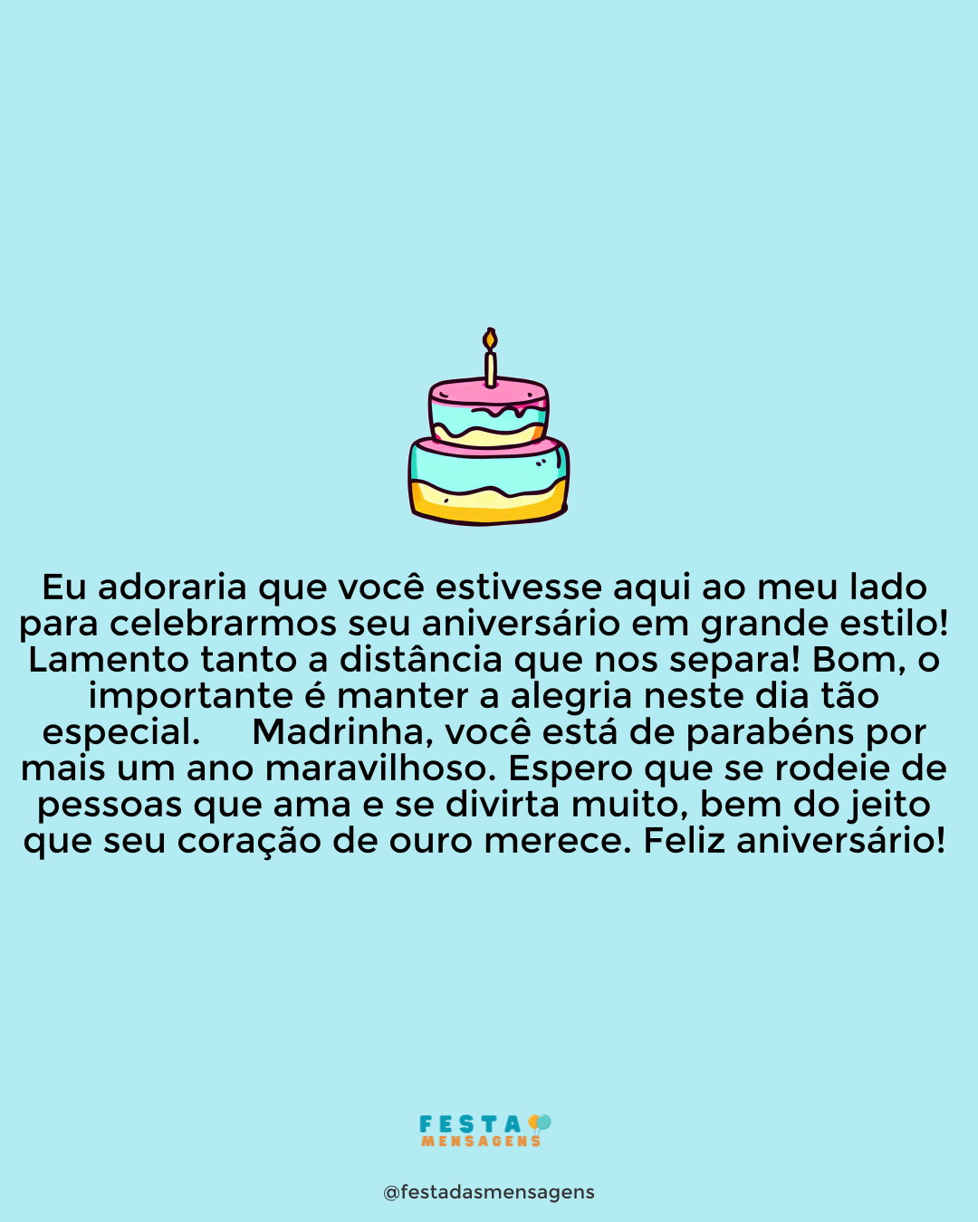 Quando você nasceu, os seus pais me presentearam com um anjo. Deram-me um grande voto de confiança ao me escolherem para ser a sua madrinha. Uma madrinha não é e nem deve ser uma substituta da mãe. A madrinha é aquela pessoa que vai ajudar os pais a direcionar o novo ser que chegou ao mundo para o caminho do bem, ensinando o amor e respeito ao próximo, o poder da fé e as palavras de Deus. Deus te abençoou com a sua água ungida e abençoou a mim, pois colocou-te na minha vida. E se eu venho cumprindo bem o meu papel de madrinha, só você pode me dizer, mas uma coisa eu posso lhe garantir, você me ilumina. Você trouxe alegria e muitos aprendizados para as nossas vidas. Todos os anos, no dia do seu aniversário, eu agradeço pela missão que os seus pais me deram, pois me possibilitaram conviver com uma pessoa especial como você. A você, eu só posso desejar o que de melhor há neste mundo e que você tenha uma vida plena de saúde, paz, sabedoria, amor e fé. Meus parabéns e muitas felicidades!
