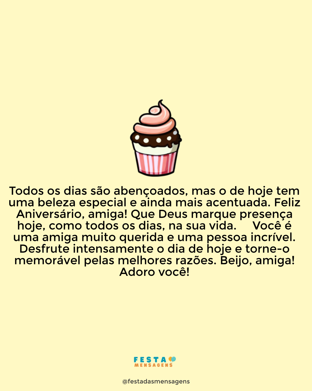 Prima doida do meu coração, que seu dia seja iluminado! Desejo tudo de bom para o seu novo ano de vida! Nunca perca este seu jeito tão especial e original, que inspira e alegra todos ao seu redor. Você é uma joia rara, uma mulher única, uma prima incrível e uma amiga ainda melhor. Desejo tudo do bom e do melhor para este seu aniversário! Parabéns!