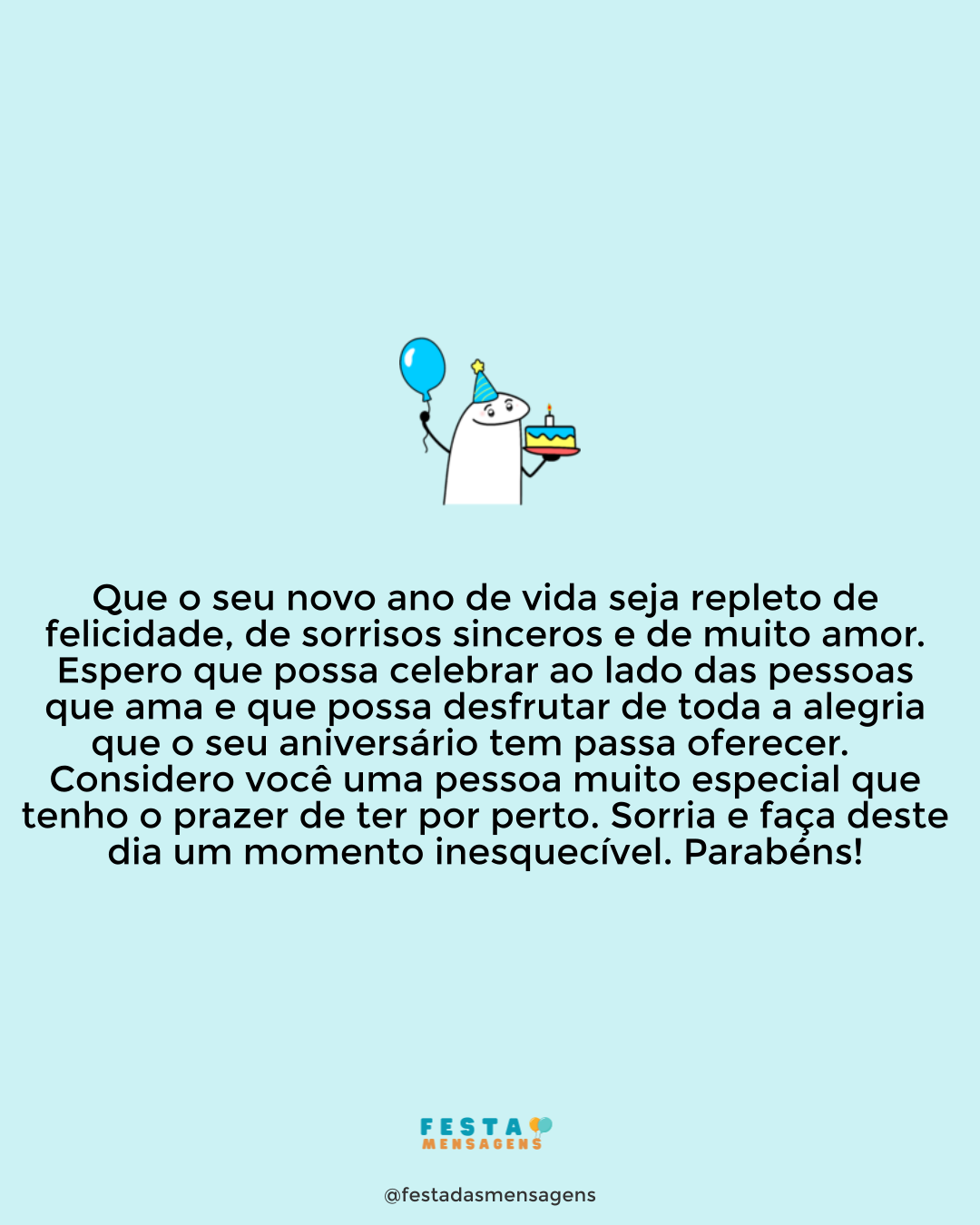 Ter você na minha vida é um presente precioso, e hoje, no seu aniversário, quero celebrar a pessoa incrível que você é, o ser humano lindo que tenho o privilégio de conhecer! Seu jeito especial faz o mundo mais bonito, e sua bondade e carinho espalham alegria por onde passa. Estou torcendo para que este dia seja repleto de amor, abraços sinceros e momentos inesquecíveis. Que a vida sempre lhe sorria e que este ano seja repleto de bênçãos e conquistas, bem do jeito que você merece. Feliz aniversário!