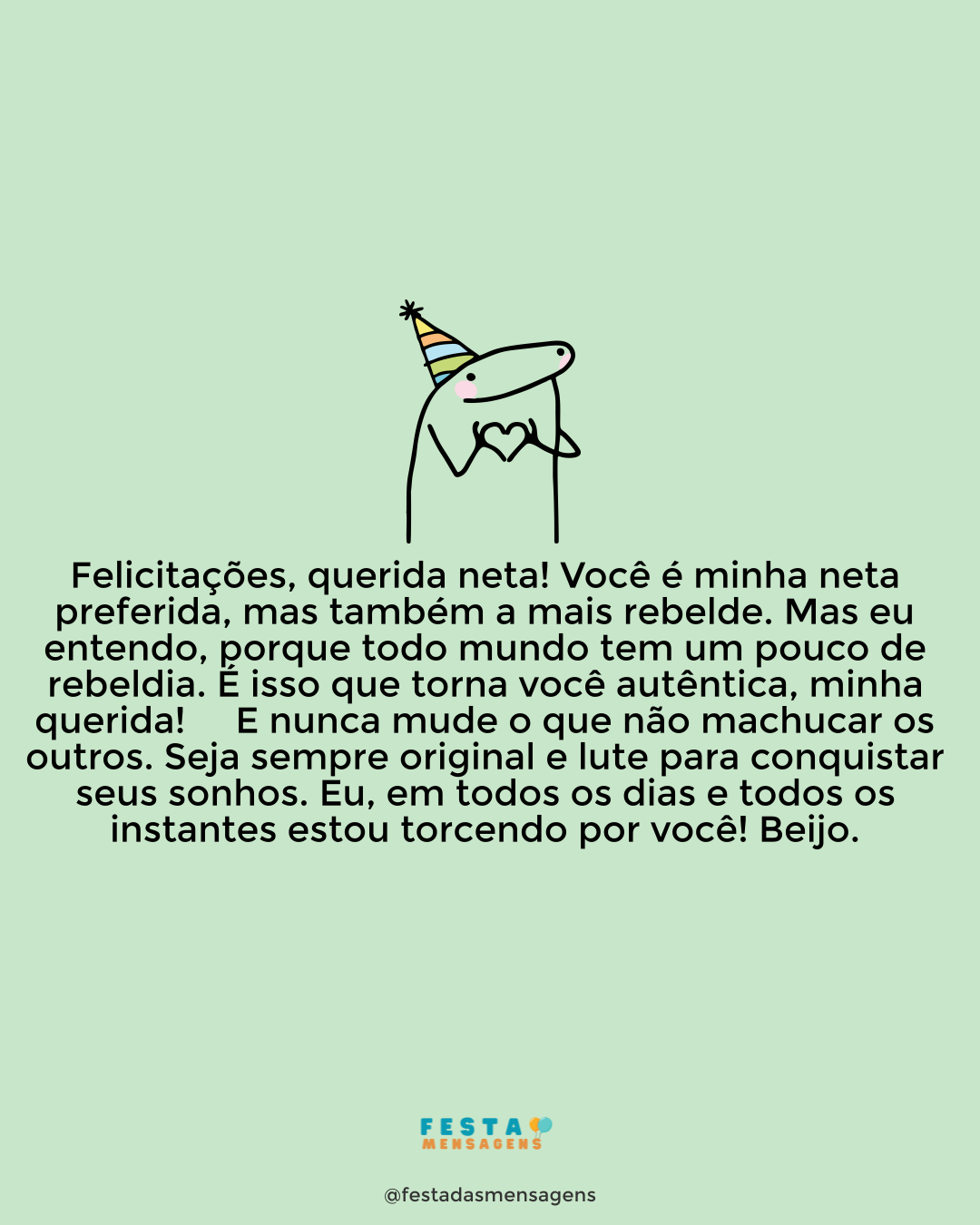 Parabéns, menina dos meus olhos e coração! Que você seja sempre muito feliz! Neste dia de alegria e festa, eu gostaria de pedir um desejo: encurtar a distância que nos separa, netinha. Eu sei que fica meio chato eu referir isso neste momento, mas eu gosto mesmo muito de você e sinto sua falta a toda hora. Hoje não é exceção! Bom, mas o importante mesmo é que você se divirta e aproveite todos os instantes deste dia tão especial. Conte comigo para tudo, querida. Perto ou distante, eu nunca estarei longe demais. Mil beijos, querida. Feliz aniversário!