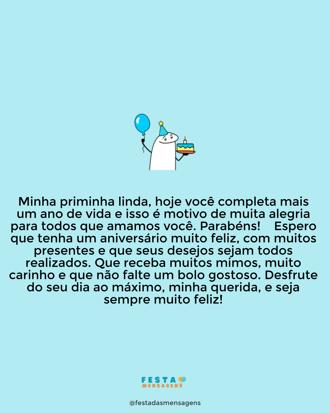 Meu bem, todos os aniversários são especiais, mas este tem um peso e uma beleza maiores. Você completa seu quinto ano de vida! São cinco primaveras cheias de cor, repletas de alegria e aventuras. Parabéns! Estou torcendo para que esta data fique para sempre gravada na sua memória pelos melhores motivos! Tenho certeza que seus amiguinhos e amiguinhas estarão junto de você e ajuda não a tornar este dia inesquecível! Feliz aniversário!