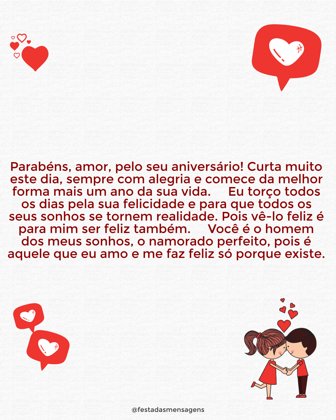 Desde o dia que nasci acho que sempre estive à espera de encontrar você na minha vida. Você além de me fazer sorrir, é com certeza um dos maiores motivos que tenho para poder dizer que sou plenamente feliz! Nunca pensei que em um planeta com tanta gente poderia realmente existir essa coisa de alma gêmea. Você me completa, e é tudo aquilo que um dia eu poderia querer! Hoje venho lhe lembrar da pessoa maravilhosa que você é, e quão importante é em minha vida! Amo você! Feliz Aniversário!