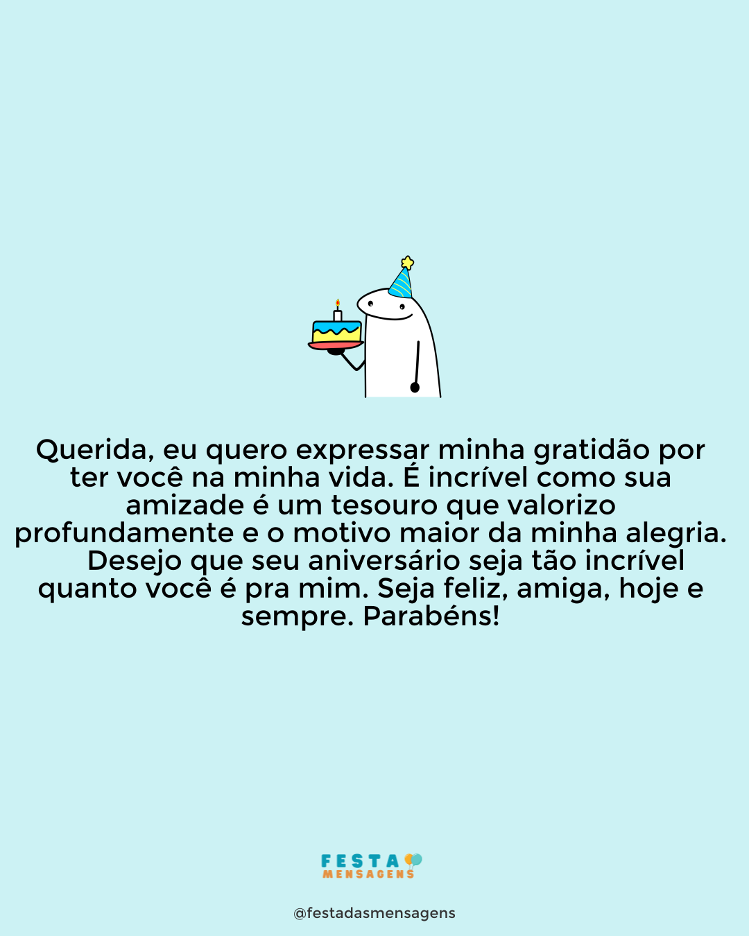 Foram tantos momentos juntas, não é mesmo? Quantas brigas, discussões por causa de ciúmes? Mas nada derrubou a nossa amizade, sabe por quê? Porque a nossa amizade é verdadeira e o amor que sentimos uma pela outra é de irmã. Feliz aniversário! Você é aquela amiga que é conselheira, que me diz quando estou errada, pois eu sei que só quer o meu bem. Você é aquela amiga que fez eu pagar os piores micos da vida, mas vale a pena passar todos os minutos da minha vida ao seu lado, e que esses minutos nunca acabem. Saiba que você é a melhor amiga do mundo, aquela que me entende e que aceita do jeito que eu sou, e que está sempre para o que der e vier. Obrigada por secar as minhas lágrimas, e me ouvir nos momentos que eu mais precisei. Que Deus abençoe a nossa amizade! Parabéns para você, minha eterna amiga!