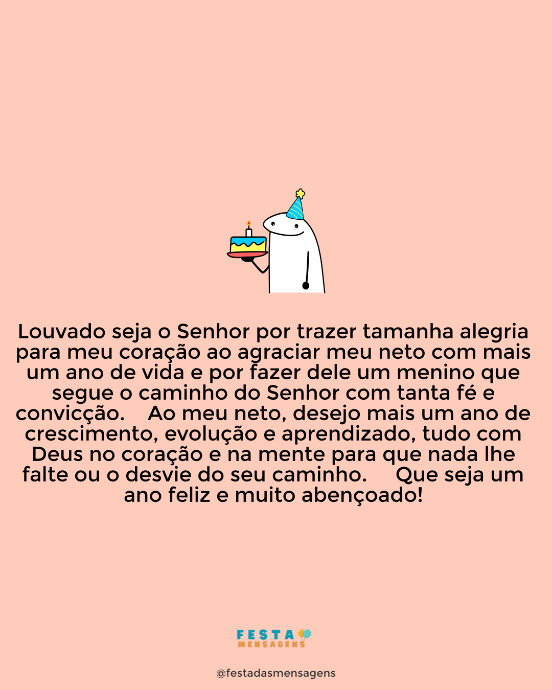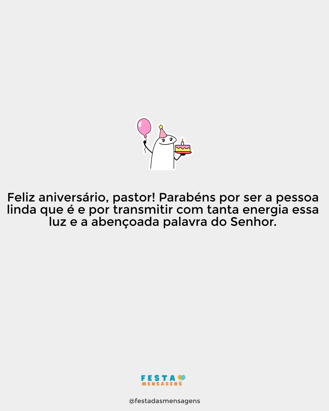 Feliz aniversário! Deus lhe concedeu mais um ano de vida e por isso deve-se alegrar e agradecer. Pois cada dia é uma dádiva de misericórdia e bondade do Senhor, e deve ser aproveitada ao máximo. Tenha um dia muito feliz, e que Deus abençoe você com muita saúde, paz, amor e felicidade!