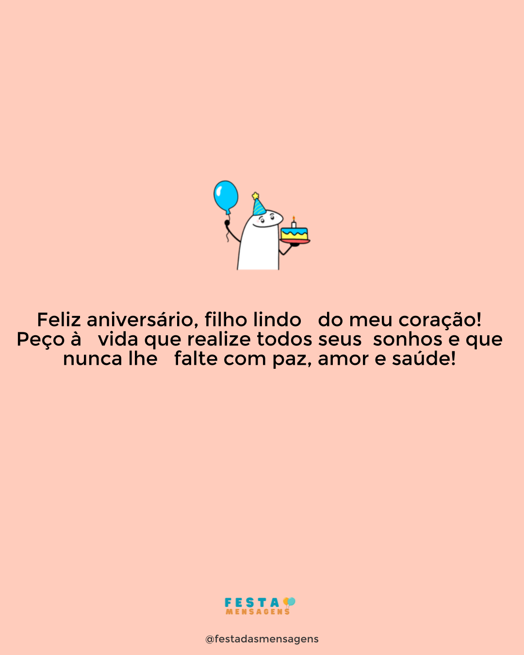 Ser sua mãe é o maior privilégio desta vida, é a maior das sortes e a alegria incrível que mora no meu coração. Filho, parabéns pelos dezesseis anos mais lindos de sempre! Estou torcendo para que você se divirta muito, hoje e sempre, e também para que esta data fique para sempre marcada na sua memória pelas melhores razões! Você é um adolescente incrível, com um coração de ouro e um sorriso simplesmente maravilhoso que contagia tudo e todos ao seu redor. Continue assim, meu filho! Tenho muito, muito orgulho em você. Feliz aniversário!
