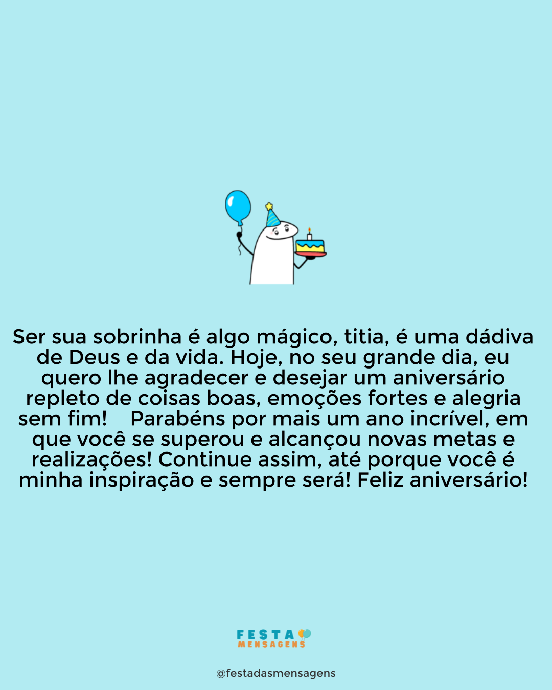 Com uma vida tão agitada, às vezes não percebemos quanto não expressamos os nossos sentimentos. Você, por exemplo, é uma pessoa muito especial na minha vida e nem sempre tenho a oportunidade de demonstrar quanto é importante e querida. Mas hoje espero que tudo isso seja resolvido pois quero declarar todo o amor que sinto por você, querida madrinha. Você é um figura importantíssima para mim, me mostrou o valor da solidariedade, e principalmente como o nosso Deus é a melhor fonte de felicidade. Você é um exemplo singular que esteve sempre presente nos melhores momentos da minha vida. Saiba que amo você incondicionalmente, e aproveito para pedir desculpas por não ter feito visitas com mais frequências. Que o Senhor possa cobrir a sua vida de bênçãos e que nos permita comemorar com você muitos outros anos de vida. Que nunca lhe falta saúde nem motivos para viver próxima da alegria. Feliz Aniversário, Dinda!