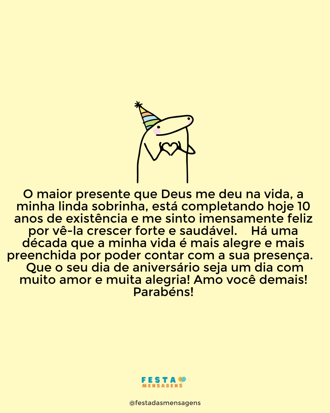 Feliz aniversário, querida sobrinha! Receba com alegria e gratidão mais esta graça de Deus que é completar mais um ano de vida. Desfrute do seu dia, da sua juventude, mas nunca esqueça de agradecer ao Senhor por todas as dádivas que recebe diariamente. Que mais um ano traga mais sabedoria e sua fé seja fortalecida. Que Deus abençoe você com muita saúde, amor e paz. Que na sua caminhada Ele a acompanhe e lhe dê a força necessária para enfrentar as dificuldades como momentos de aprendizagem, e os bons com gratidão e humildade. Eu amo muito você, minha querida, e para o que precisar sabe que pode contar comigo! Seja feliz e celebre seu dia na paz de Cristo!