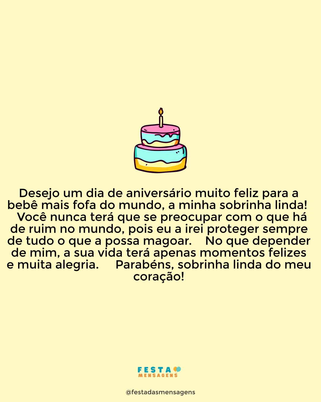 Minha netinha linda, hoje é o seu dia e não poderia estar mais feliz por você! Esse ano a distância vai me impedir de comemorar o seu aniversário ao seu lado, mas vou esperar ansiosamente por todas as fotos da sua festa. A cada ano que passa você fica mais incrível e esbanja talento e determinação. Sei que não há nada nesse mundo que você não consiga conquistar se concentrar seus esforços. É uma pena não estar aí com você, mas vou estar aqui mandando muito amor e pensamentos bons! Parabéns e muitas felicidades! Você é um amor de neta!