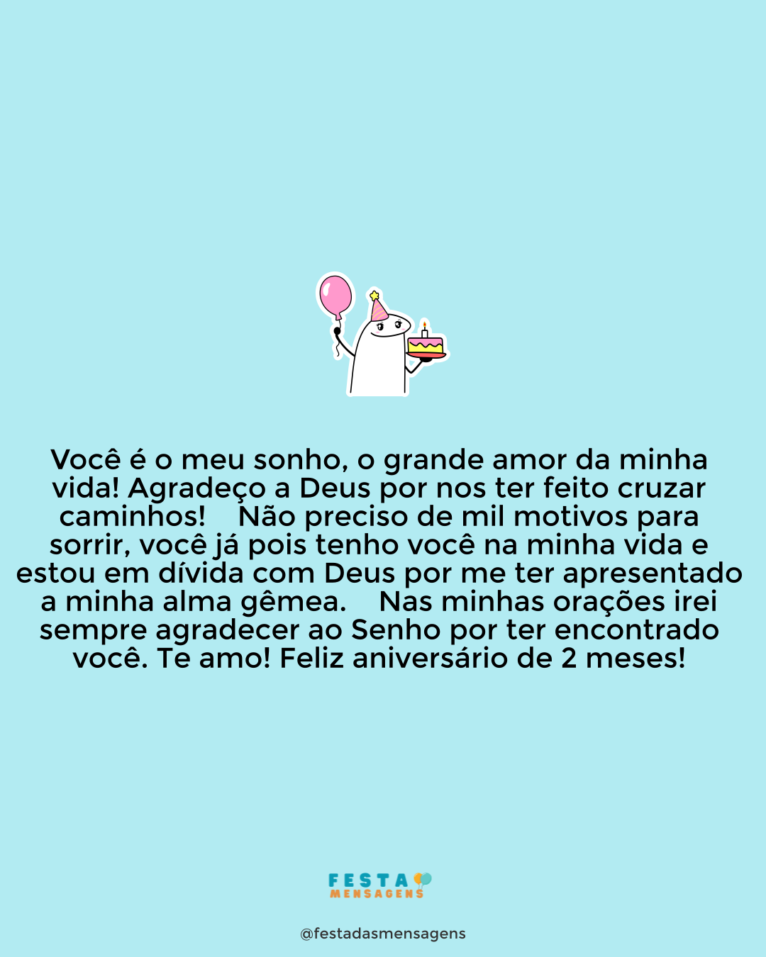 Estamos juntos há 8 meses. Ao olhar para trás, penso que não mudava nada na minha vida. Tudo pelo que passei valeu a pena, pois foi o caminho que tive de percorrer até chegar a você. Com você, eu descobri o que era o amor genuíno e puro. Descobri o que era amar alguém mais que a própria vida. Descobri o que queria realmente dizer alma gêmea. Te amo mais que tudo neste mundo! Feliz 8 meses de namoro, meu grande e único amor!