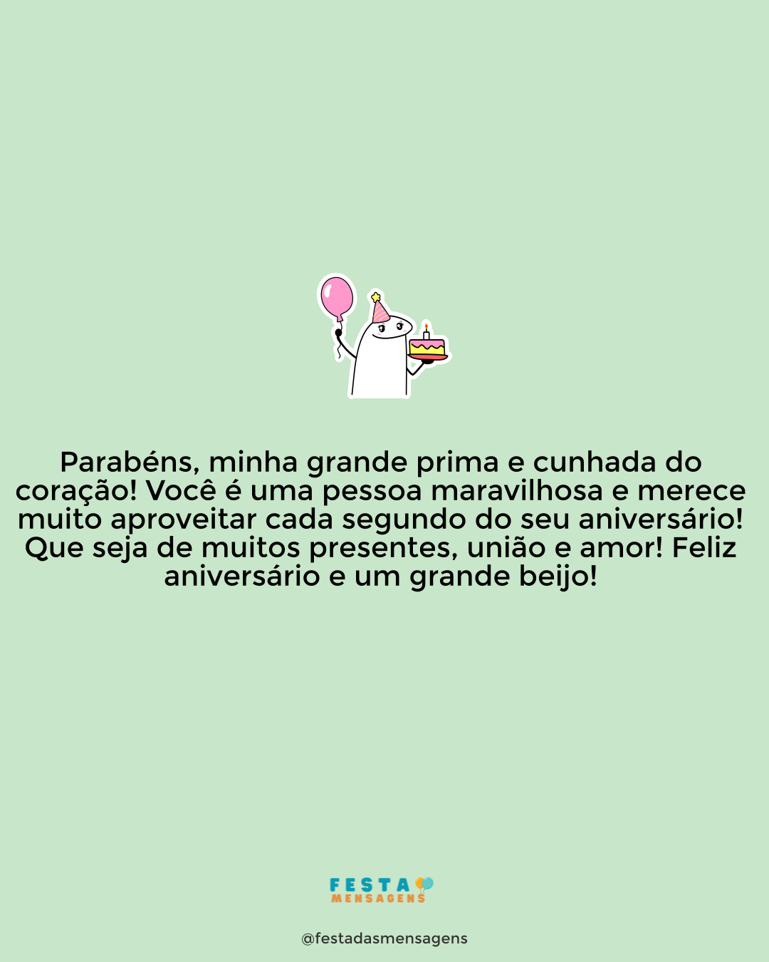 Hoje que celebramos o seu dia especial, o dia do seu nascimento, querida cunhada, tenho que lhe dizer que, ao longo da vida, discordei com o meu irmão em quase tudo, menos quando ele decidiu casar com você. Tenho muita sorte em ter alguém na família que é a minha melhor amiga e uma irmã para mim! Espero que você tenha um dia fabuloso e muito anos de vida!