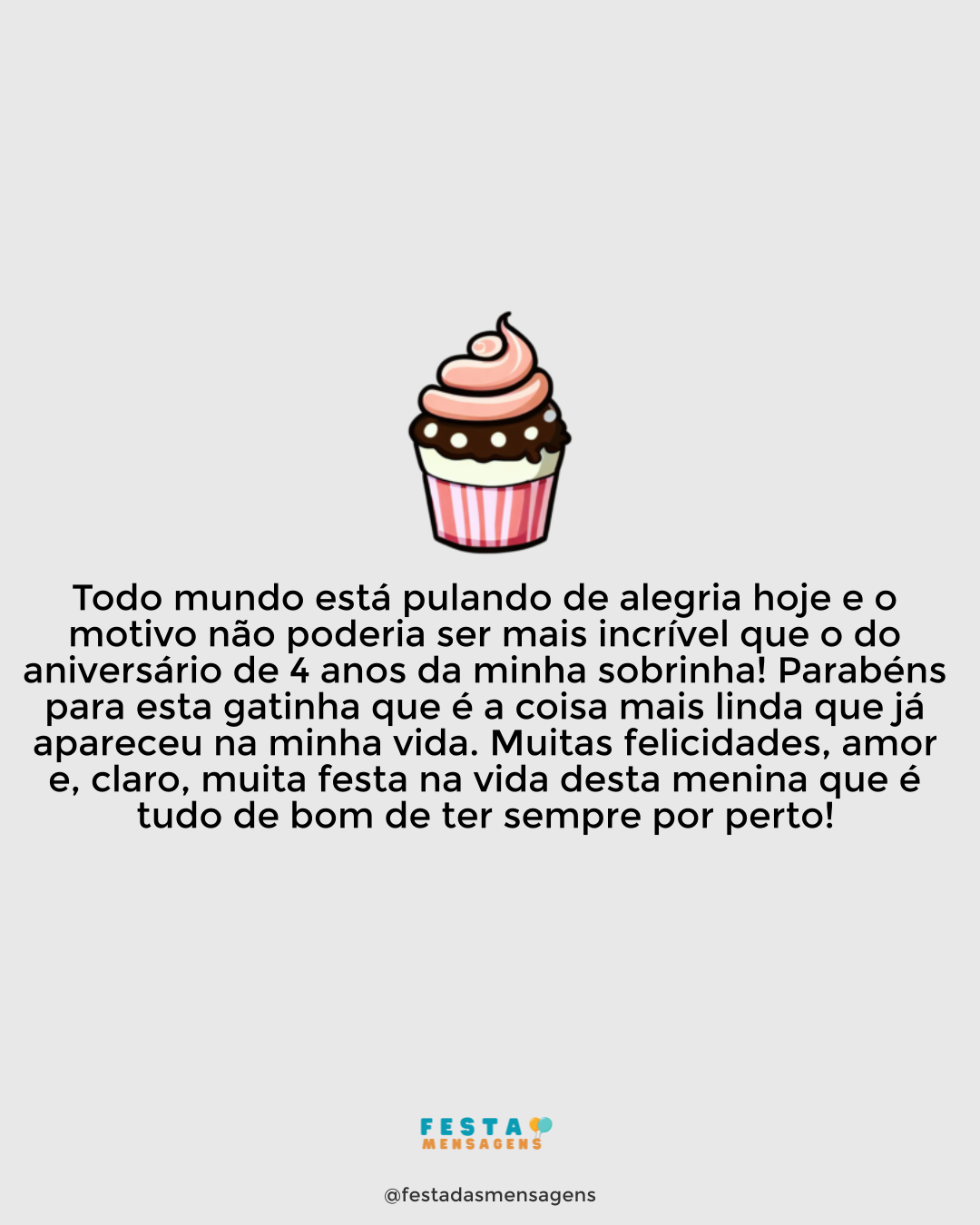 Como é bom estar aqui para vê-la completar mais um ano. Minha sobrinha neta espero que saiba que desejo a você apenas as melhores coisas do mundo. Você é uma menina especial, orgulho da família e sei que seu novo ano de vida será abençoado. Deus recompensa aqueles de bom coração. Aproveite seu dia e saiba que saber que você existe traz muita alegria aos meus dias. Tenha um feliz aniversário!