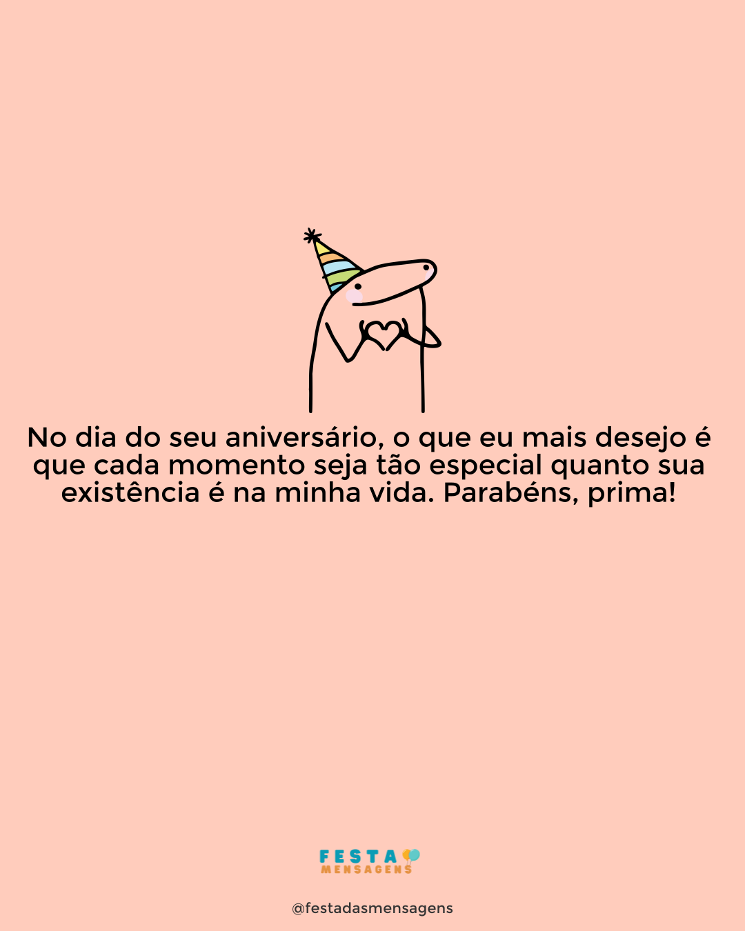 Oh prima, parabéns! Aliás, prima é pouco, pois somos praticamente irmãs. Desejo a você um fantástico dia de aniversário. Você sabe o quanto eu te amo. Por tudo que passamos, por todas as gargalhadas, por todos aqueles abraços de conforto, eu tenho seu nome tatuado em meu coração. Dizer que somos primas é pouco até, nós somos praticamente irmãs. Neste dia tão especial, eu desejo a você o melhor do mundo. Beijo gigante. Adoro você. Parabéns.