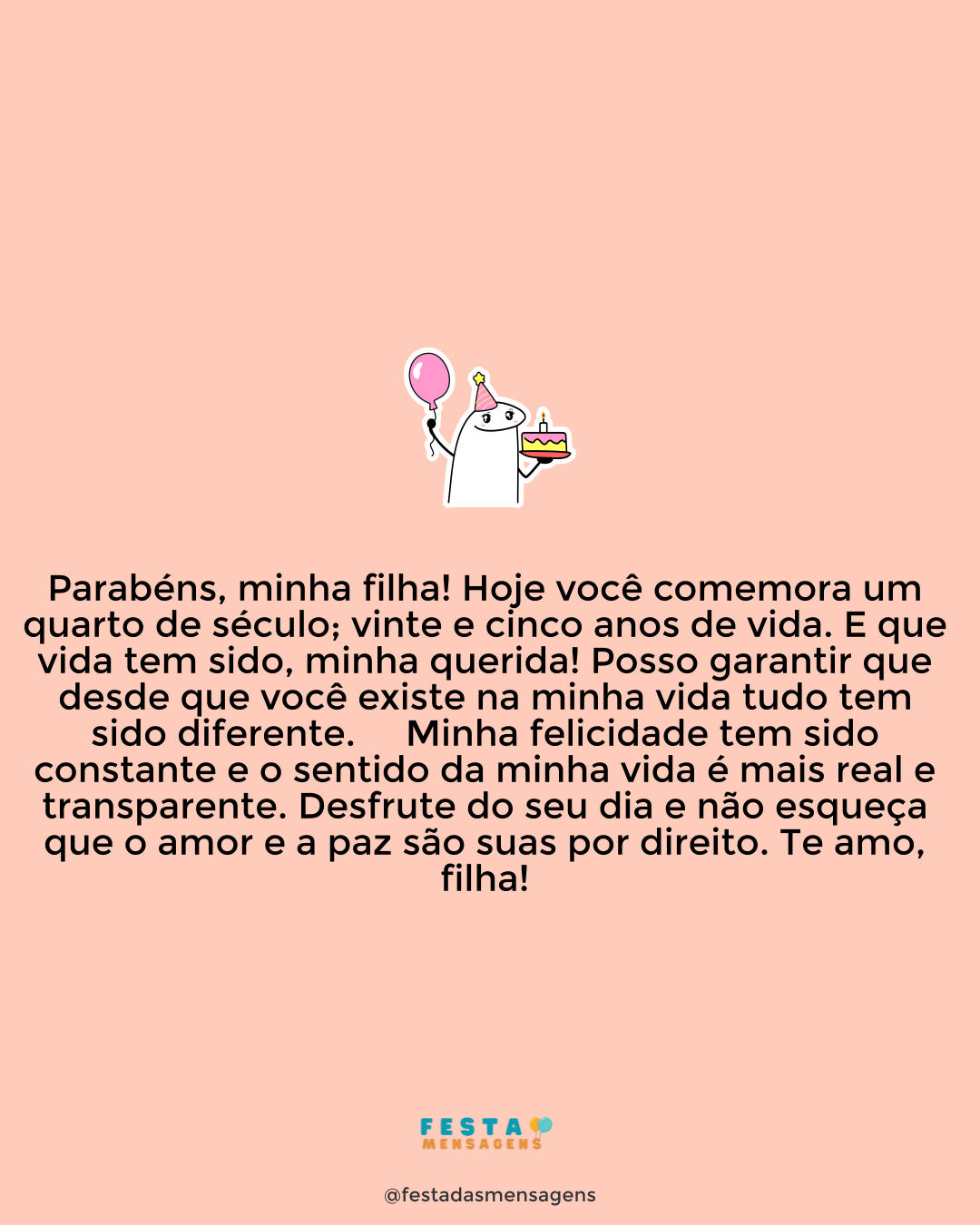 Eu gosto muito de você, prima doida, aliás, quem nos conhece sabe que parecemos mais irmãs do que outra coisa. É exatamente por esse nosso lindo sentimento que hoje eu estou especialmente feliz. Parabéns, priminha! Estou torcendo para que sua jornada seja a mais linda de sempre, para que seu aniversário contenha muitas surpresas, alegrias e presentes. Divirta-se, prima! Divirta-se muito, porque ninguém merece mais que você! Além de você ser a maluca mais fofinha do universo é também o ser humano mais doce que algum dia tive o privilégio de conhecer. Quero que saiba que a adoro e irei sempre adorar! Feliz aniversário, prima!