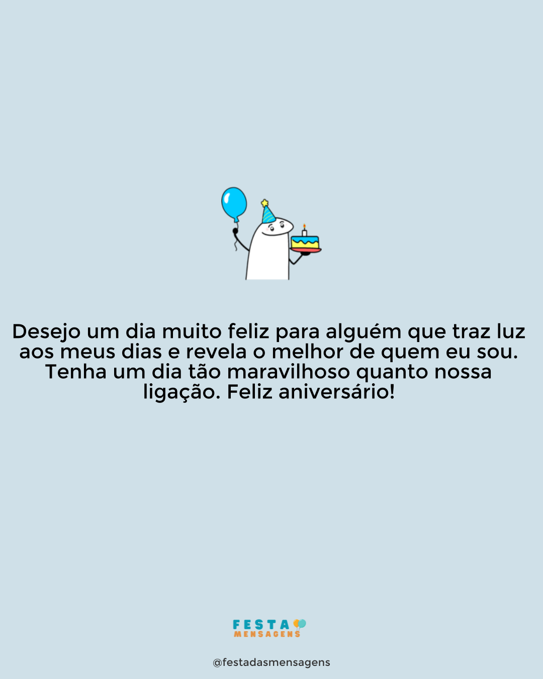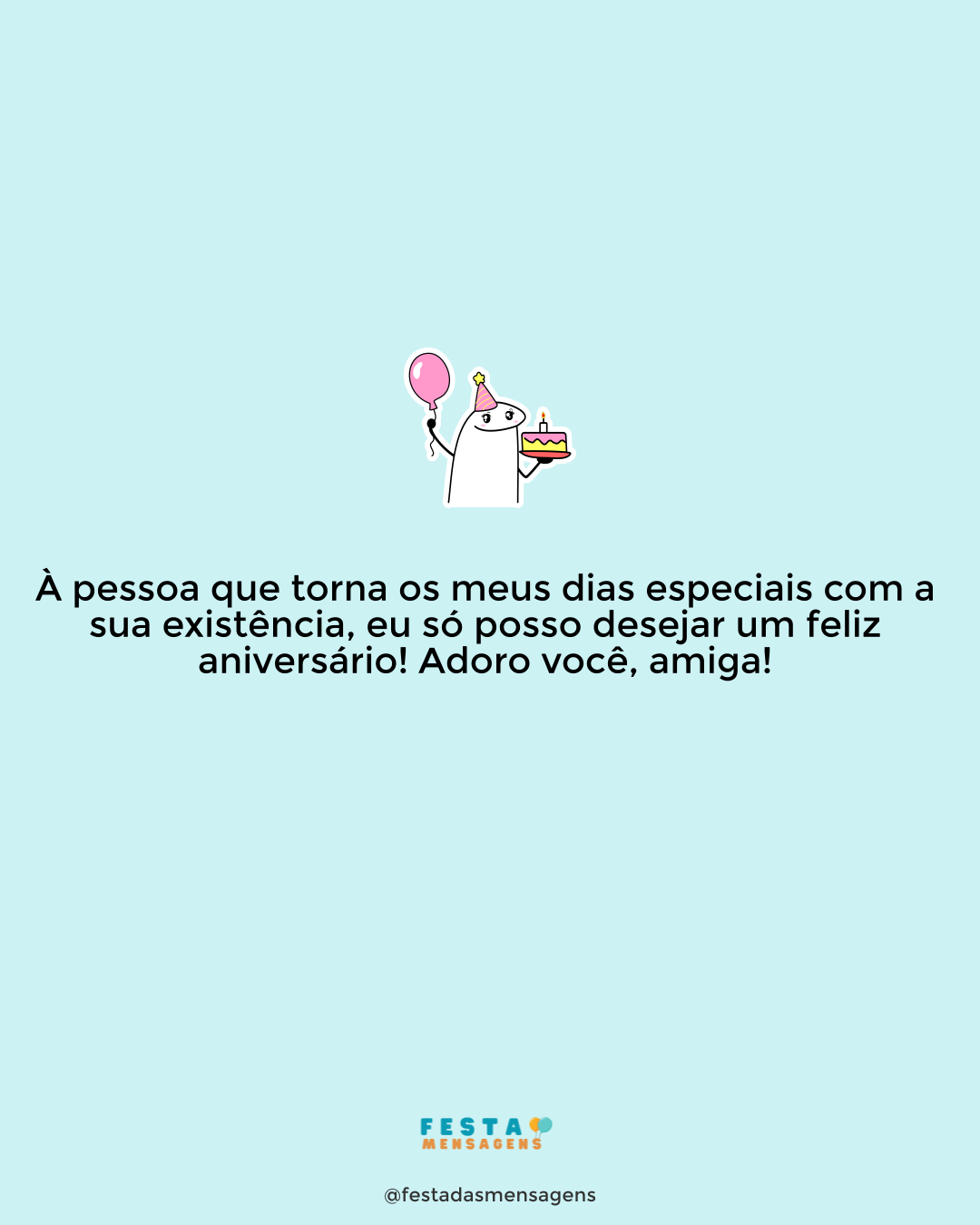 Parabéns Amiga! Em dias como hoje nem consigo descrever o tamanho da saudade que sinto. Você faz tanta falta aqui do meu lado que a felicidade do nosso reencontro é algo para mim inimaginável. Apesar da distância o sentimento de amizade que bate aqui no meu peito nunca mudou. Você sempre foi e sempre será a minha melhor amiga, mesmo que um dia vá morar na China. Sei que esse distanciamento foi muito mais complicado para você, mas faça o possível para quando a saudade bater relembrar da vitória que só está esperando o momento certo para aparecer. Não se esqueça nem por um segundo a pessoa corajosa e esforçada que você é. Chegar onde chegou não foi nada fácil, mas o sucesso está cada vez mais próximo. Você merece toda a felicidade do mundo e enquanto eu puder usar palavras para aproximar você dela, recitarei até o dicionário se for preciso. Que com a chegada desta nova idade suas forças sejam renovadas, que muitos sorrisos ainda sejam moldados e todos os seus objetivos possam ser alcançados. Aproveite o dia de hoje para atrair tudo que lhe trouxer felicidade e que ao mesmo tempo todos os níveis de bons sentimentos sejam elevados ao máximo. Feliz Aniversário!