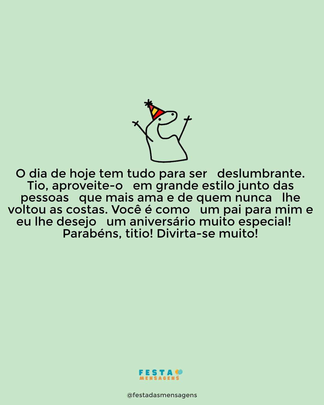 Meu tio pai, não tem como lhe agradecer o tanto que já fez por mim. Espero que esteja a ter o dia de aniversário maravilhos que você merece e que se divirta muito. Amo você do fundo do meu coração! Que Deus proteja sempre você!