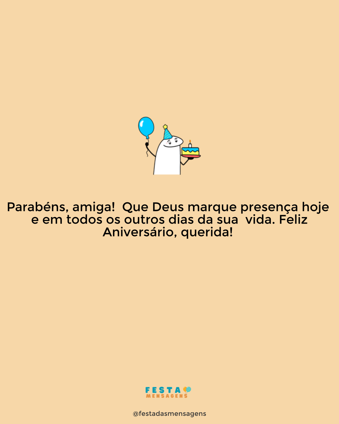 Minha amiga querida, me lembro até hoje das primeiras palavras que trocamos e das primeiras impressões que tive sobre você. Confesso que nunca imaginei que a nossa amizade se tornaria tão forte e duradoura, mas você mostrou ser, a cada dia, uma pessoa mais e mais especial, confiável e leal. Hoje, posso dizer que você é um presente valioso que Deus colocou na minha vida. Neste dia tão especial que é o seu aniversário, eu só posso desejar que você receba tanto amor, carinho e atenção como costuma dar aos seus amigos e às pessoas que você considera. Que Deus ilumine sempre a sua vida para que você continue sendo esta pessoa maravilhosa, que faz toda a diferença no mundo. Obrigada pela sua amizade! Parabéns à minha grande amiga do coração! Desejo que a vida seja muito boa e feliz para você.