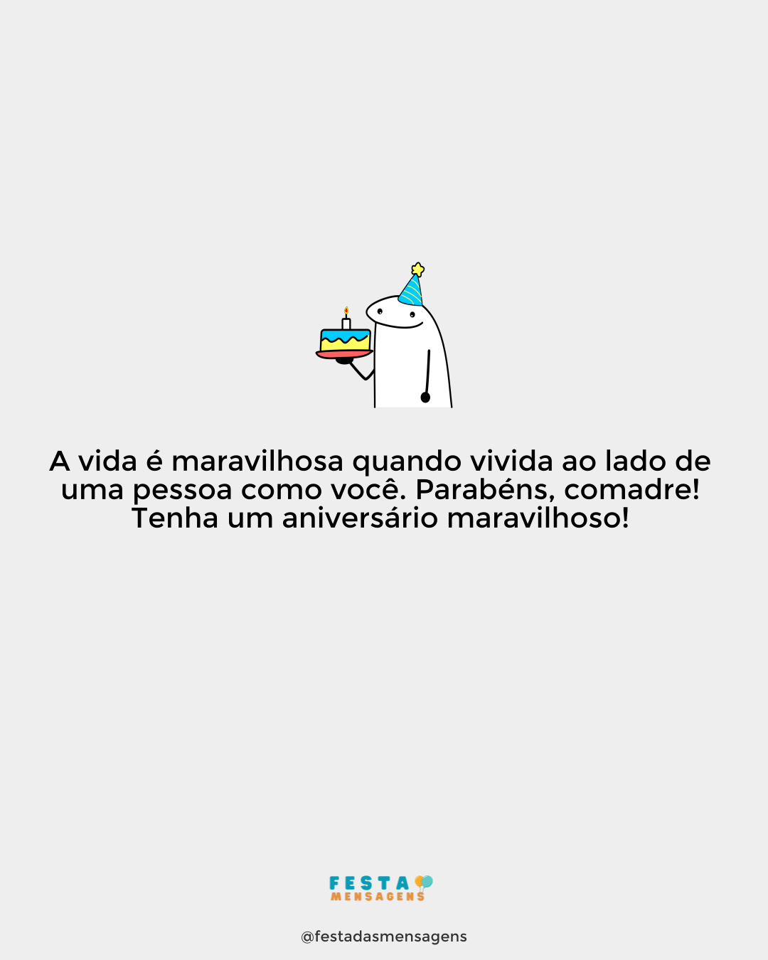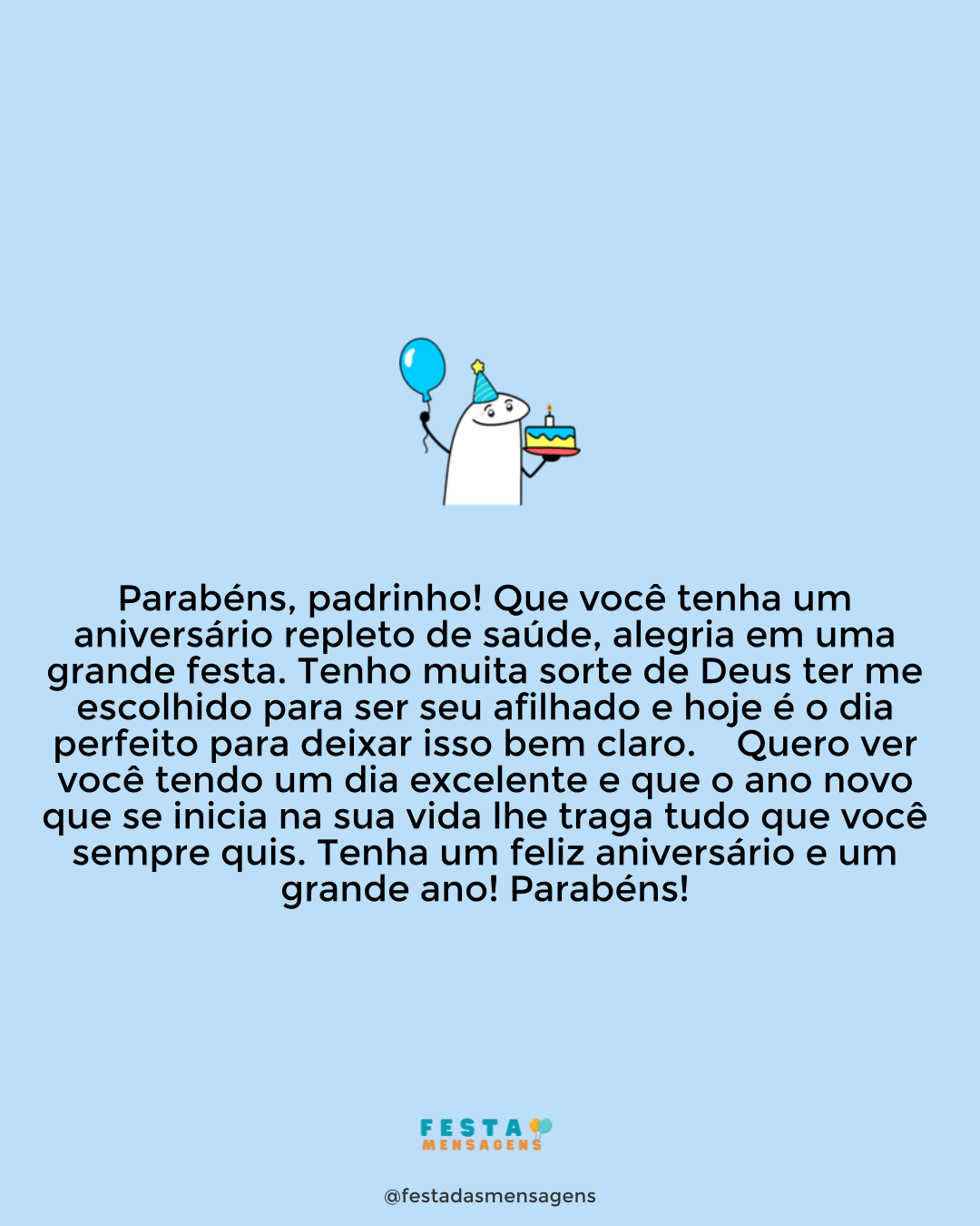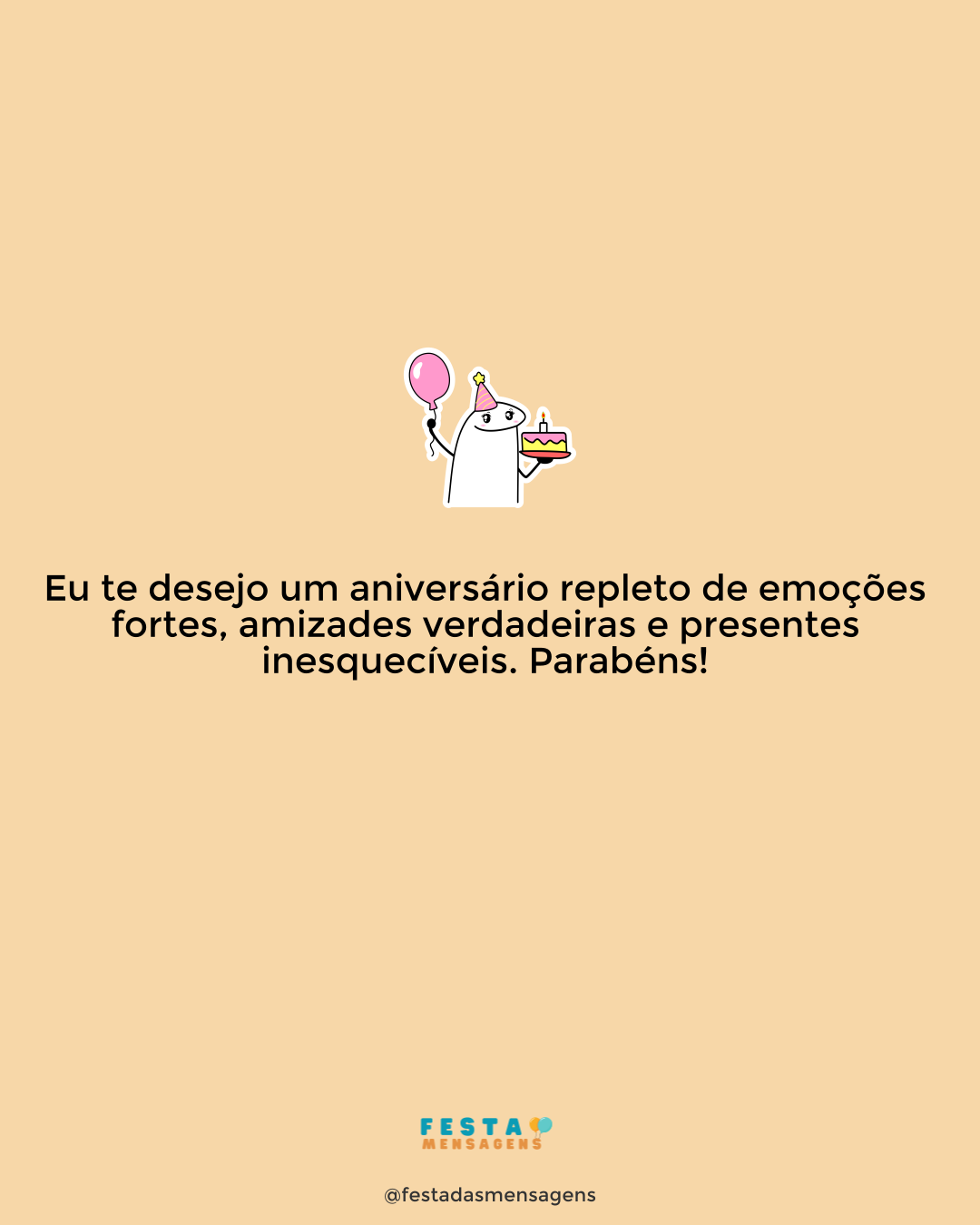 Parabéns! Hoje é um dia muito especial, e tudo que eu espero é que ele seja só o começo de doze meses incríveis para você. Desejo, do fundo do meu coração, que a vida lhe presenteie com momentos felizes, realizações e muita paz. Celebre cada instante, pois você merece tudo que existe de melhor neste mundo. Feliz aniversário!
