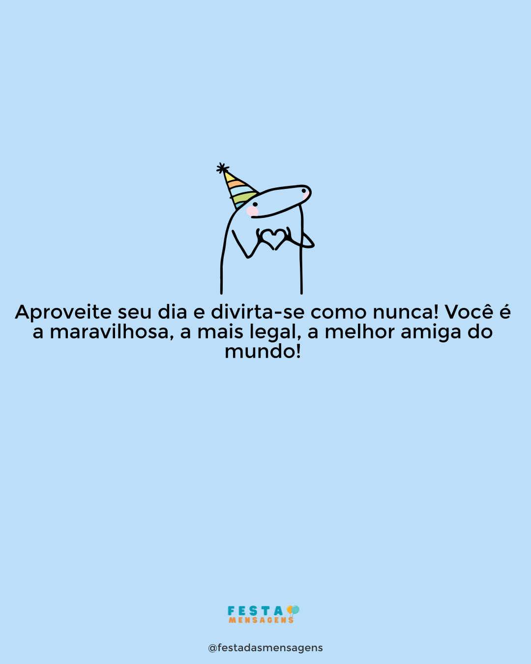 Feliz aniversário! Hoje você completa mais um ano de vida e eu não poderia deixar de dizer como a nossa amizade é importante. Você é como uma irmã para mim e eu valorizo cada segundo que tenho com você! Para algumas pessoas pode parecer estranho que duas pessoas do sexo oposto tenham uma amizade tão forte como a nossa, mas para nós isso tão natural quanto o amor entre irmãos. Por isso, minha irmã, aproveite muito o seu dia e a felicidade que faz parte dele. Te desejo muito amor, sucesso e saúde, sempre. Um grande beijo, amiga!