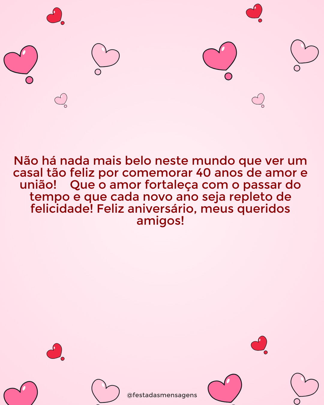 Quando penso no matrimônio perfeito, imediatamente me lembro de vocês dois. O amor que vos une é tão especial e único que não tem ninguém no mundo que não sonhe um dia poder experienciar um amor igual. Em todas as relações existem altos e baixos e quanto mais longa, mais momentos difíceis têm que ultrapassar. Tenho certeza de que nem tudo foram rosas nos últimos 60 anos, mas vocês sempre do lado do outro, contra tudo e contra todos, se apoiando mutuamente e isso é o que se deve salientar. Parabéns pelos 60 anos de felicidade conjugal! Felizes bodas de diamante!