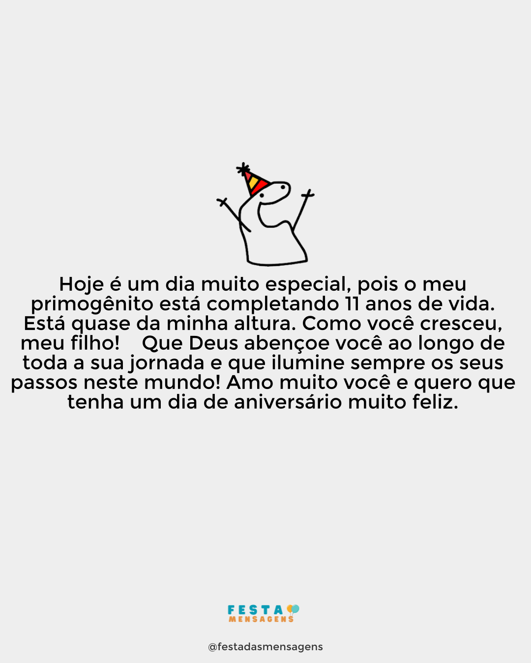 Desejo um aniversário de amor, filho! Eu tenho muito orgulho de ser seu pai e de ter o privilégio de vê-lo crescer. Hoje, você completa 11 anos e eu me emociono em perceber como o tempo passa. Desculpe se fico um pouco emotivo, mas é que o amor que sinto é imenso e a vida está passando rápido demais. Aproveite seu dia, brinque muito, porque você ainda é criança e merece curtir esta fase ao máximo. Nunca se esqueça que pode contar comigo para tudo. De pai para filho, de amigo para amigo, desejo um feliz aniversário!