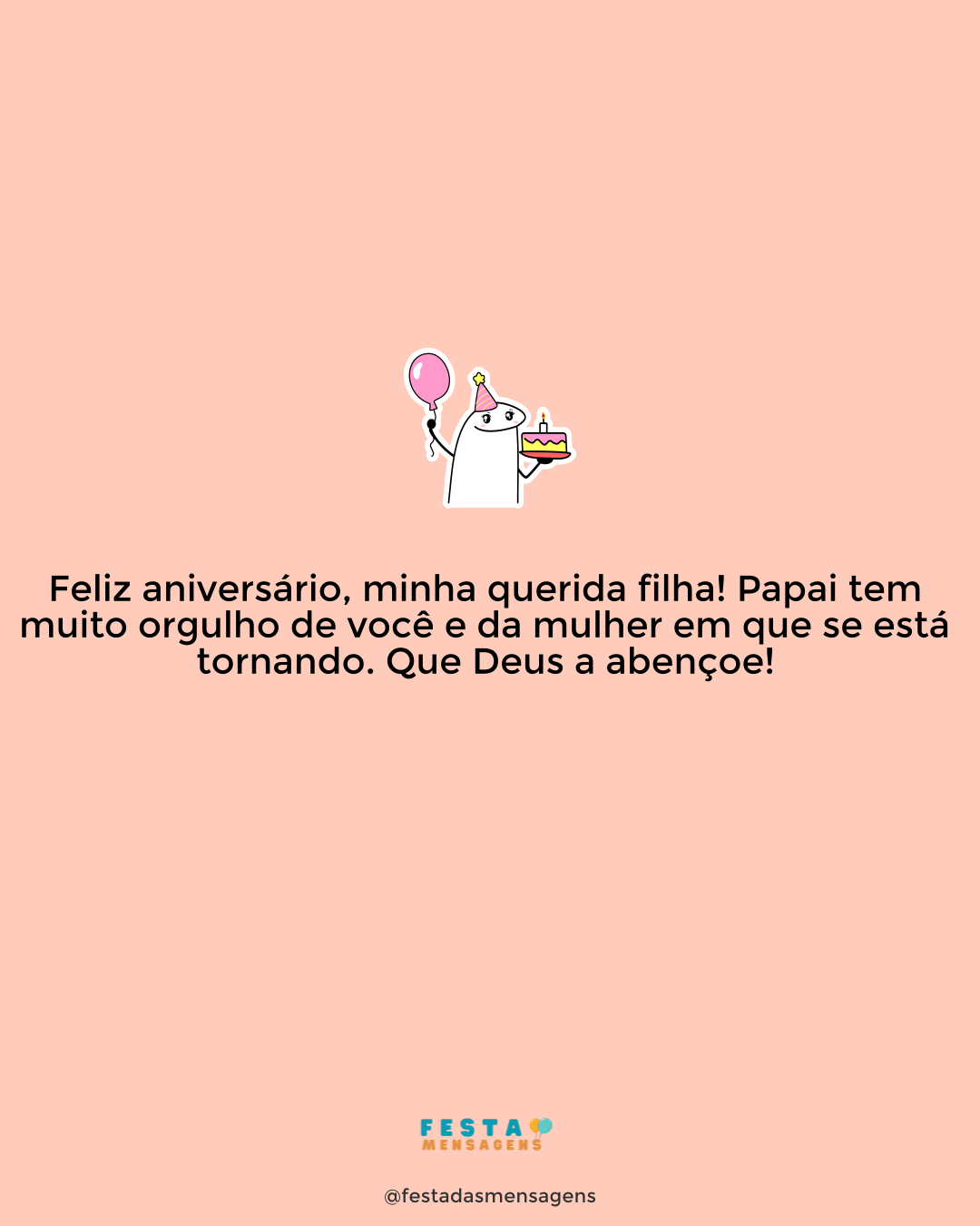 Há 13 anos, ganhei um presente de Deus, uma bênção na minha vida que veio para me mostrar a verdadeira felicidade. Filha amada, que neste dia você sinta todo o amor que guardo para você. Desejo que seu aniversário seja um momento de muita alegria, pois você é uma menina abençoada. Aproveite cada segundo do seu dia e nunca esqueça que estarei sempre ao seu lado. Seja feliz, sorria e desfrute de toda a beleza do seu aniversário. Parabéns, minha filha!