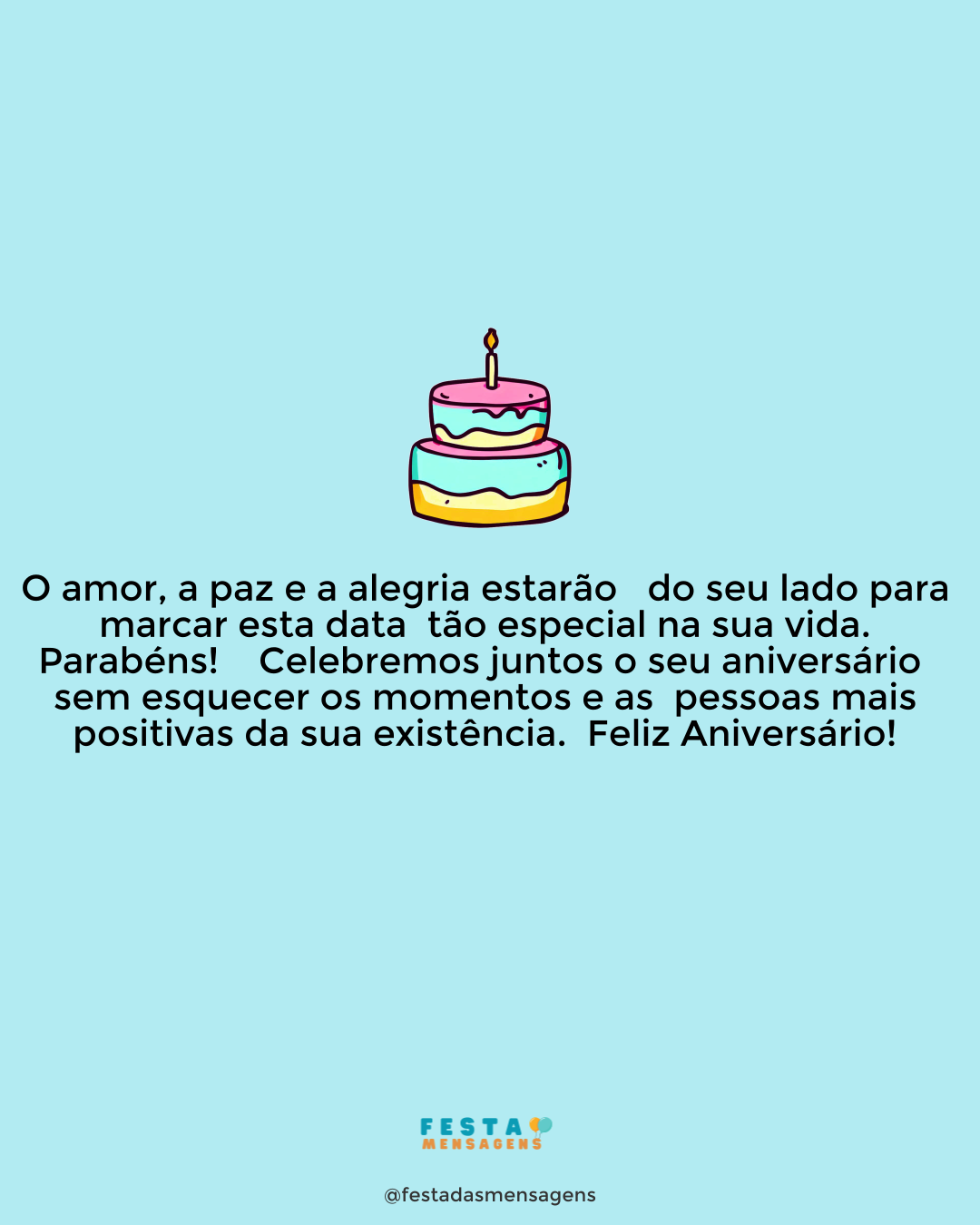 Desejar feliz aniversário todos os anos de uma forma diferente nem sempre é uma tarefa muito fácil. Mas conforme sua imagem aparece em minha mente, todos os neurônios se conectam e me fazem recordar muitas outras formas de lhe desejar felicidade. São tantos sentimentos que correm dentro do meu peito que às vezes tenho medo de não conseguir me expressar direito. Sempre há algo novo por descobrir, novas formas de abraçar, de demonstrar carinho e até novas reações para os meus beijos. Você me fascina a cada encontro, faz meu coração bater mais forte, liberando as melhores sensações que existem dentro de mim. A você desejo apenas a felicidade, e que todos os momentos da sua vida possam ser relembrados com um sorriso, sem que nenhum arrependimento seja sentido. Que a alegria invada sua vida e nunca mais o largue, permitindo a você ótimos momentos que durem uma eternidade. Que a nossa vida esteja para sempre ligada. Você preenche minha vida de bons sentimentos e eu peço a Deus todos os dias que o nosso amor jamais acabe. Parabéns, amor da minha vida! Tenha um ótimo dia e um feliz aniversário!