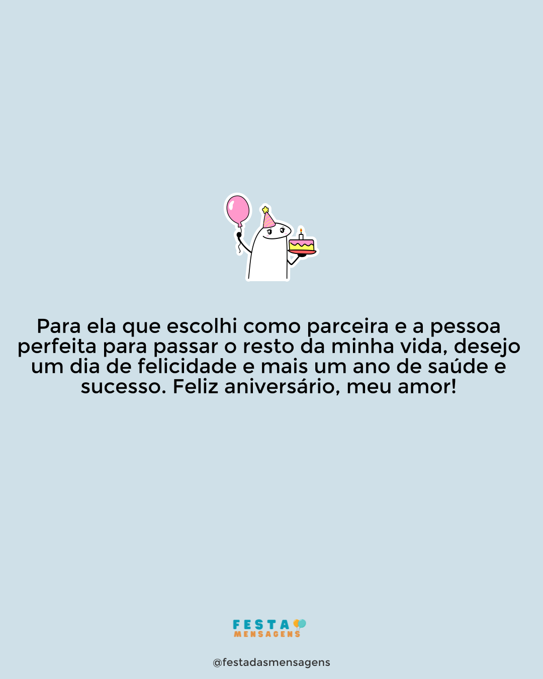 Desejar feliz aniversário todos os anos de uma forma diferente nem sempre é uma tarefa muito fácil. Mas conforme sua imagem aparece em minha mente, todos os neurônios se conectam e me fazem recordar muitas outras formas de lhe desejar felicidade. São tantos sentimentos que correm dentro do meu peito que às vezes tenho medo de não conseguir me expressar direito. Sempre há algo novo por descobrir, novas formas de abraçar, de demonstrar carinho e até novas reações para os meus beijos. Você me fascina a cada encontro, faz meu coração bater mais forte, liberando as melhores sensações que existem dentro de mim. A você desejo apenas a felicidade, e que todos os momentos da sua vida possam ser relembrados com um sorriso, sem que nenhum arrependimento seja sentido. Que a alegria invada sua vida e nunca mais o largue, permitindo a você ótimos momentos que durem uma eternidade. Que a nossa vida esteja para sempre ligada. Você preenche minha vida de bons sentimentos e eu peço a Deus todos os dias que o nosso amor jamais acabe. Parabéns, amor da minha vida! Tenha um ótimo dia e um feliz aniversário!