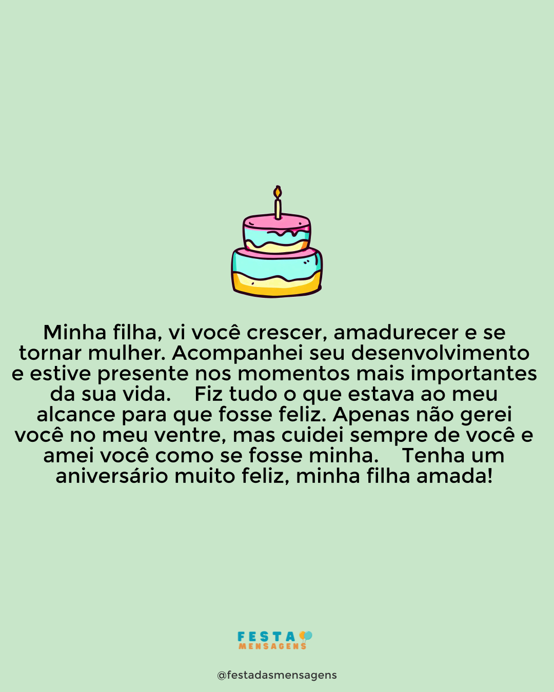 Filha, hoje nada vai dar errado! Prometo que todos os seus sonhos vão se realizar e os seus presentes mais desejados serão recebidos pelas suas mãos. Querida, parabéns por completar uma década de existência neste mundo! E parabéns por ser essa menina tão agradável, generosa e muito delicada. Tenho muito orgulho em ter uma filha tão maravilhosa! Aproveite muito seu dia, filhinha! Divirta-se com seus amiguinhos e também com toda sua família que só quer o seu bem. Princesa, rodeie-se de boas sensações, sentimentos deslumbrantes e pessoas inesquecíveis. Hoje e sempre. Feliz aniversário!