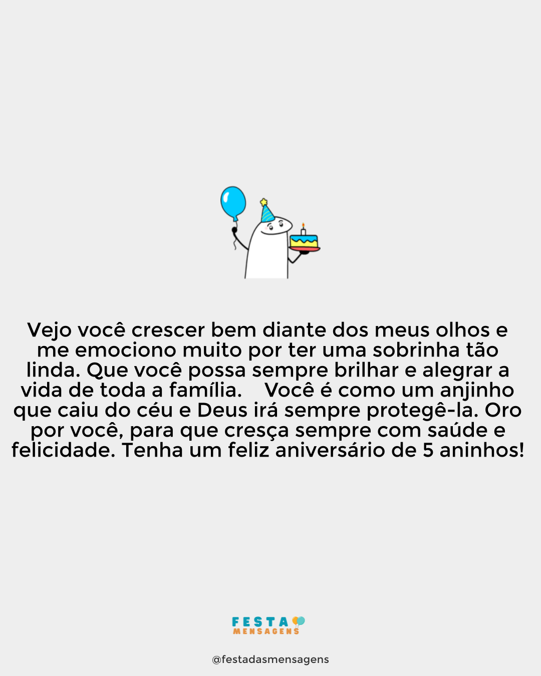 Muitas felicidades neste dia iluminado que é o seu aniversário, querida neta! Glória a Deus por ter trazido ao mundo alguém tão especial! Que a paz do Senhor habite o seu ser todos os dias da sua jornada e que as muitas maravilhas de Deus floresçam ao longo da sua caminhada para que nunca perca o seu rumo! Feliz aniversário!