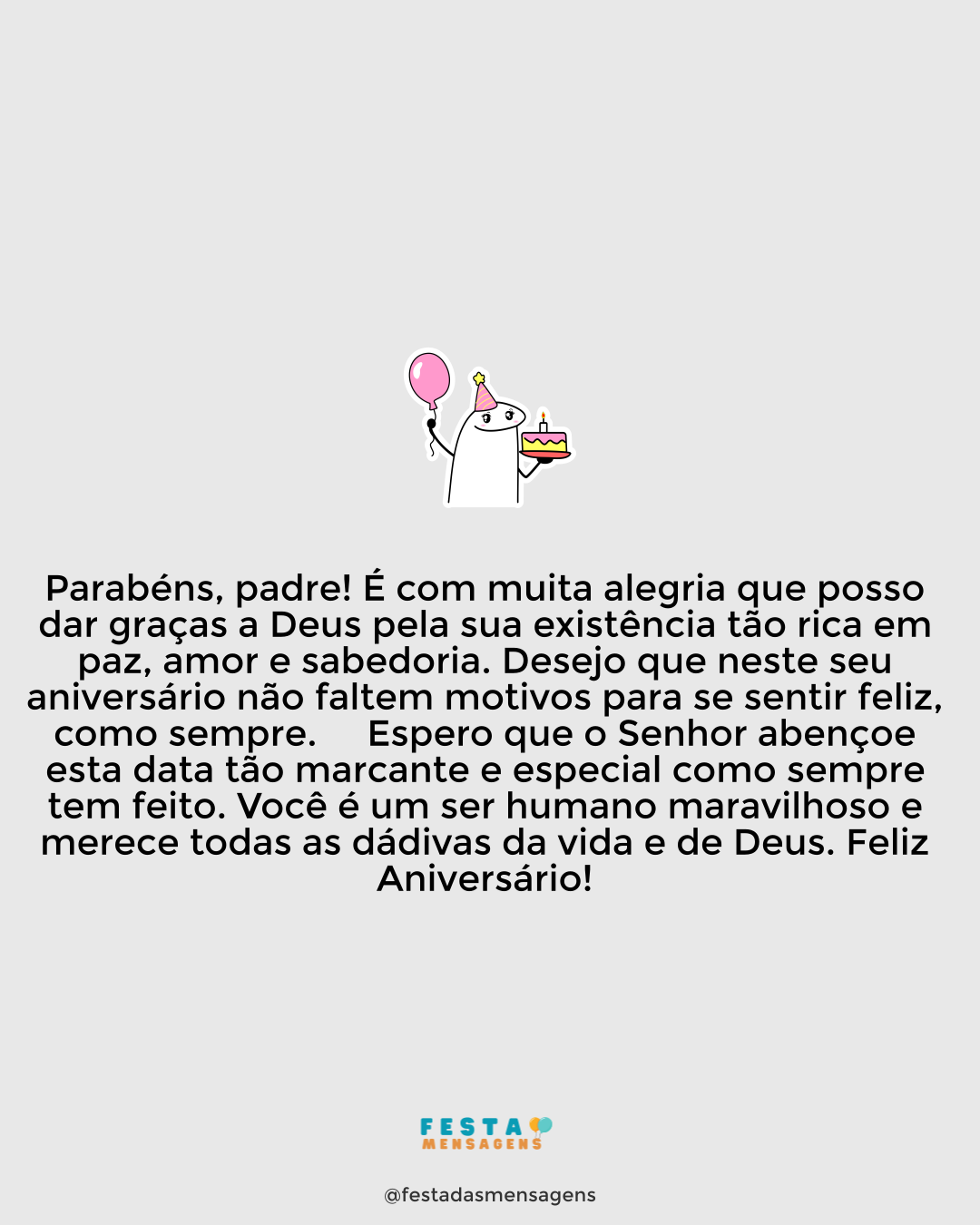 Eu sei quanto você se dedicou para me dar tudo que eu precisava, pai, e estarei sempre aqui para retribuir todo o amor e carinho. Aproveite este dia ao máximo e saiba que torço muito por você. Espero que sempre encontre o caminho para a felicidade e para uma realização pessoal. Você merece tudo de bom e todo o amor do mundo. Amo você. Tenha um feliz aniversário!