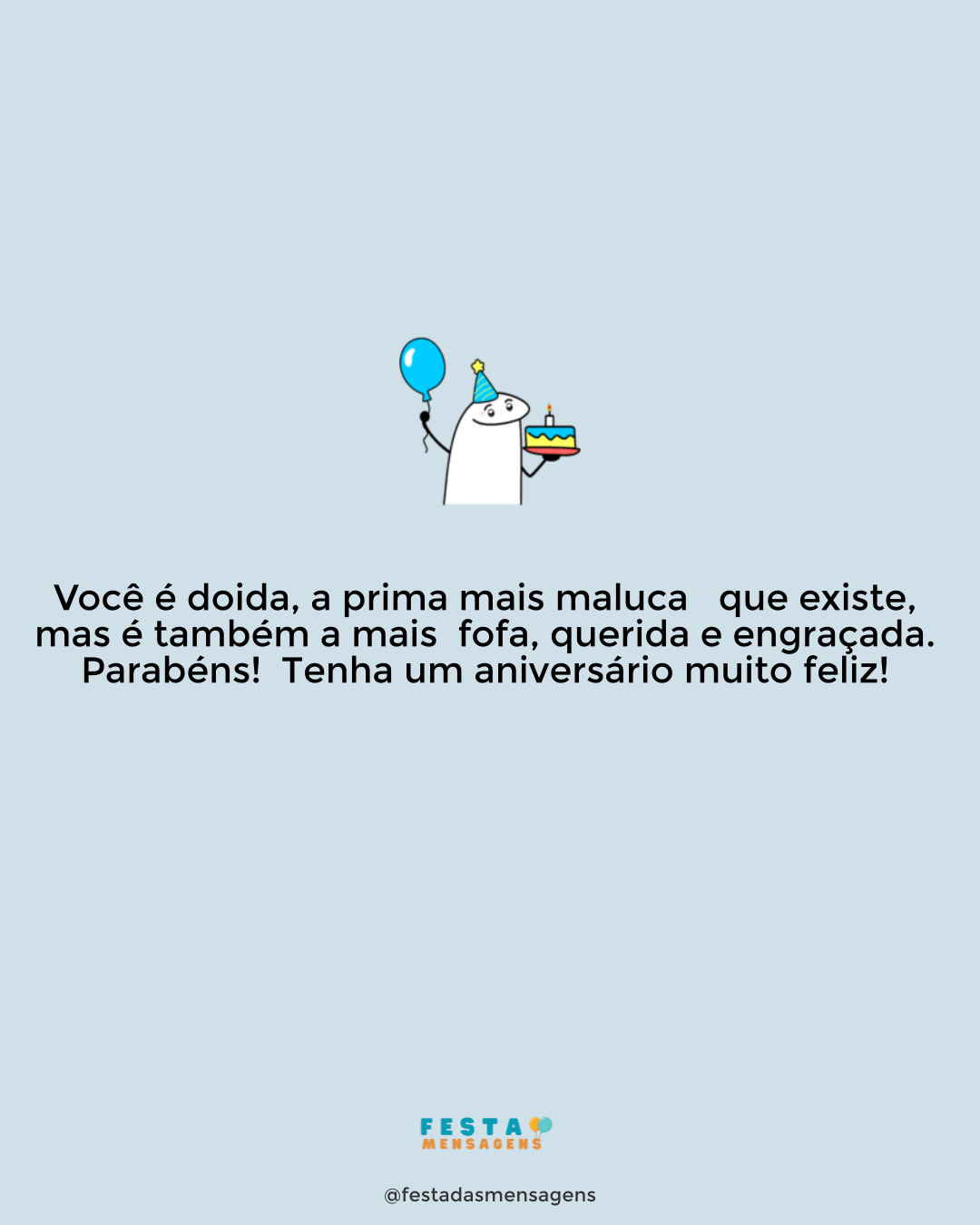 Você é doida, a prima mais maluca que existe, mas é também a mais fofa, querida e engraçada. Parabéns! Tenha um aniversário muito feliz!