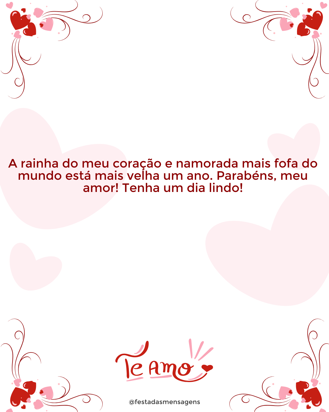 A sua felicidade também é minha e é por isso que eu quero tanto ver você sempre com o coração repleto de alegrias. Parabéns por mais um ano de vida, meu amor!