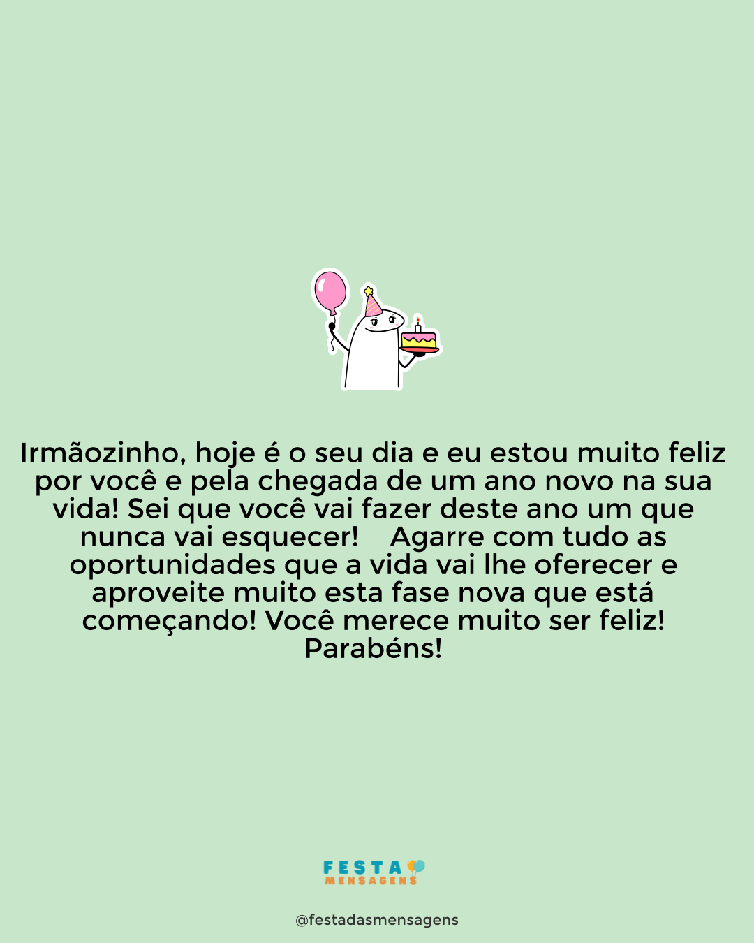 Parabéns! Hoje é um dia muito especial, e tudo que eu espero é que ele seja só o começo de doze meses incríveis para você. Desejo, do fundo do meu coração, que a vida lhe presenteie com momentos felizes, realizações e muita paz. Celebre cada instante, pois você merece tudo que existe de melhor neste mundo. Feliz aniversário!