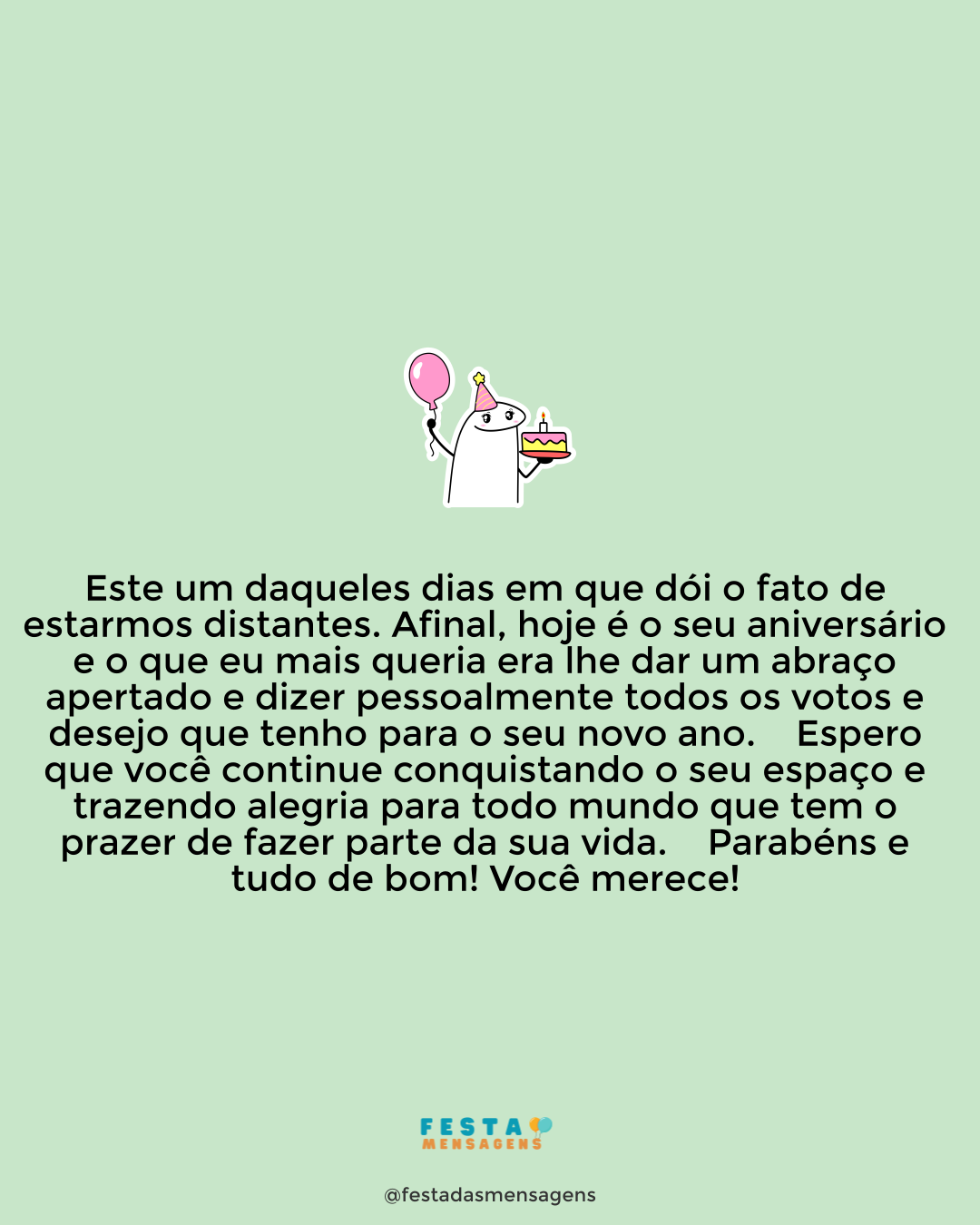 Querida neta, hoje o dia é de festa, porém, é também de saudade devido à distância que nos separa. Parabéns por mais um ano cheio de emoções fortes, conquistas e alegrias. Feliz aniversário! Eu quero que você tenha noção que a adoro profundamente; que saiba que faria qualquer coisa para a ver sorrir todos os dias. Saiba que mesmo você estando longe, eu sinto que estamos perto. É algo que só o sentimento explica, só o amor e o carinho são capazes de definir. Minha neta adorável, que a vida seja sempre sua amiga e a trate como princesa, hoje e sempre. Parabéns, fofinha!