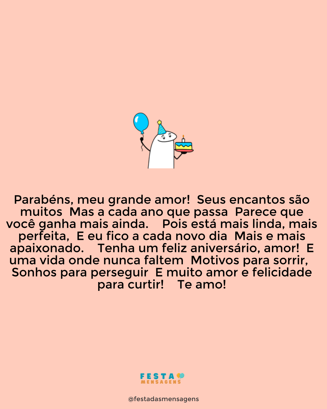 Feliz aniversário, minha amada E maravilhosa esposa! Você é a rainha do meu mundo E todos os dias sei que estou Entregue nas melhores mãos. Pois você é um anjo Que me faz muito feliz. Parabéns e curta muito seu dia!