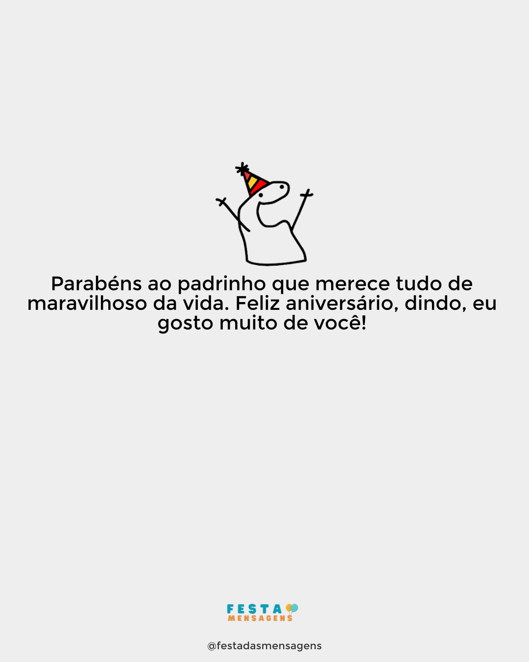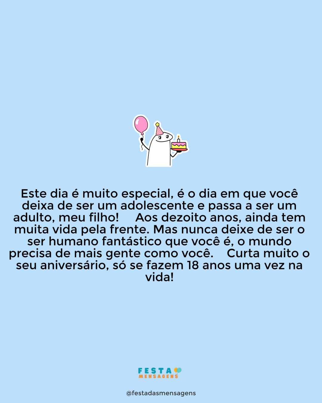 O dia que você mais esperava, chegou! É o seu 18º aniversário, afilhado, e quero lhe desejar um dia feliz! Você é livre de fazer suas escolhas e de tomar as suas próprias decisões, mas ainda precisa de estar em casa à meia-noite. Mas hoje vai poder se deitar tarde. Tenha um aniversário incrível cheio de presentes fantásticos!