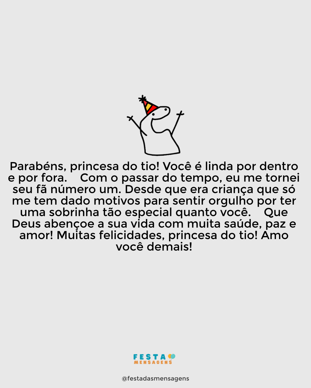 Querida sobrinha, eu não encontro palavras suficientemente maravilhosas que descrevam quão grande é minha admiração por você! Hoje, no seu grande dia, eu quero que saiba que gosto muito, muito de você. Feliz aniversário! Continue assim, correndo atrás de tudo aquilo que mais deseja e nunca se esqueça que estou e sempre irei estar ao seu lado. É que você é minha sobrinha, mas é também uma das pessoas mais incríveis que conheço neste mundo. Divirta-se muito neste seu dia, querida!