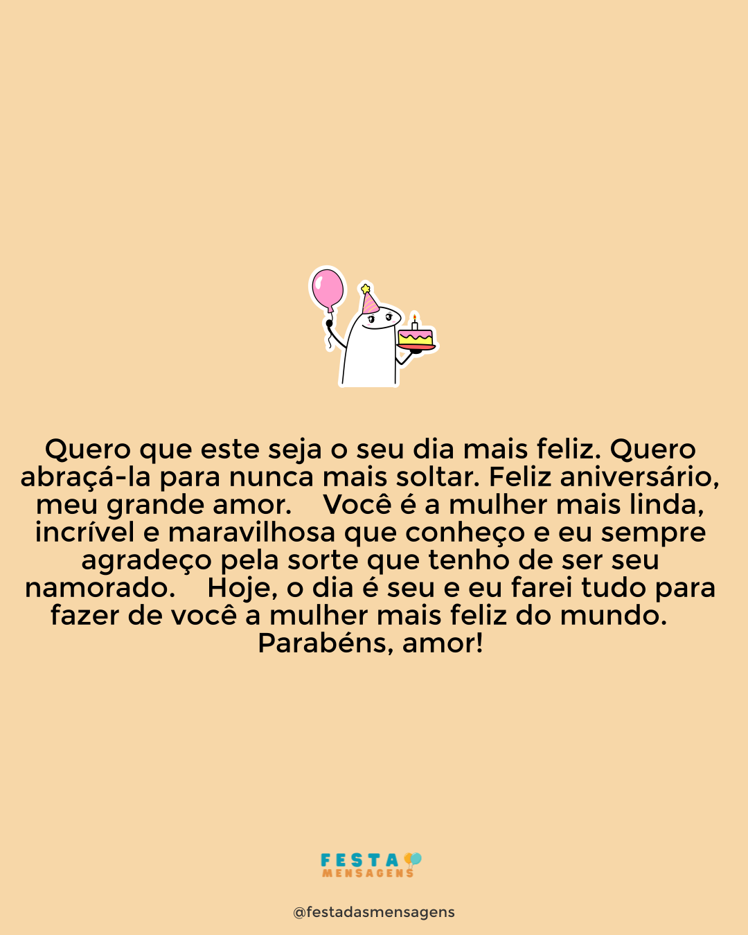 Desejar feliz aniversário todos os anos de uma forma diferente nem sempre é uma tarefa muito fácil. Mas conforme sua imagem aparece em minha mente, todos os neurônios se conectam e me fazem recordar muitas outras formas de lhe desejar felicidade. São tantos sentimentos que correm dentro do meu peito que às vezes tenho medo de não conseguir me expressar direito. Sempre há algo novo por descobrir, novas formas de abraçar, de demonstrar carinho e até novas reações para os meus beijos. Você me fascina a cada encontro, faz meu coração bater mais forte, liberando as melhores sensações que existem dentro de mim. A você desejo apenas a felicidade, e que todos os momentos da sua vida possam ser relembrados com um sorriso, sem que nenhum arrependimento seja sentido. Que a alegria invada sua vida e nunca mais o largue, permitindo a você ótimos momentos que durem uma eternidade. Que a nossa vida esteja para sempre ligada. Você preenche minha vida de bons sentimentos e eu peço a Deus todos os dias que o nosso amor jamais acabe. Parabéns, amor da minha vida! Tenha um ótimo dia e um feliz aniversário!