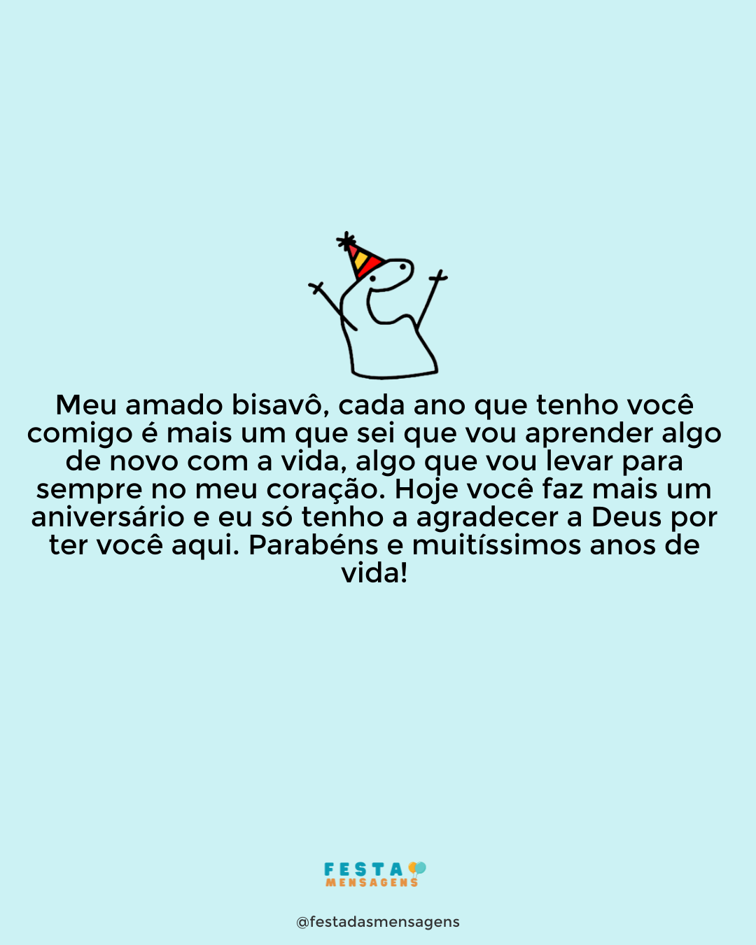 Parabéns, vovó! Que você continue encontrando muita felicidade e saúde nesta data tão querida. Você é uma verdadeira avó guerreira e só Deus sabe dos sacrifícios que já fez pela nossa família, por isso espero que você sempre seja recompensada e homenageada. Vovó, você é a minha heroína e quero tê-la para sempre comigo! Não imagino como seria a minha vida sem você por perto para me guiar, aconselhar e estimular. Por isso, lhe desejo muitíssima saúde e mais infinitos anos de vida. Amo você!