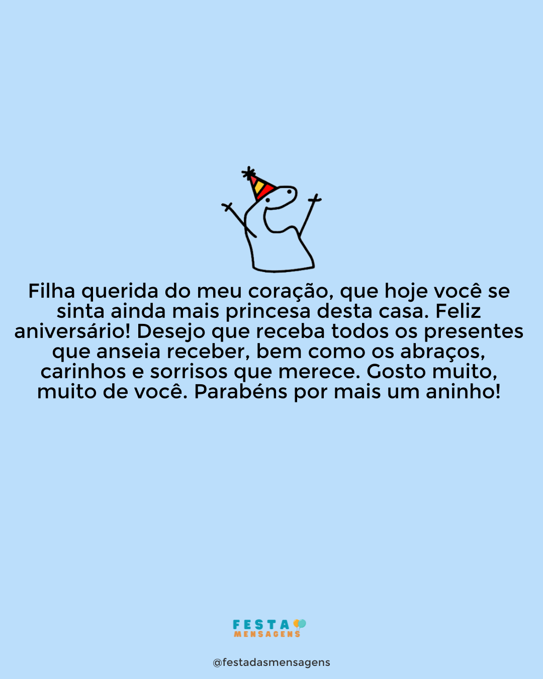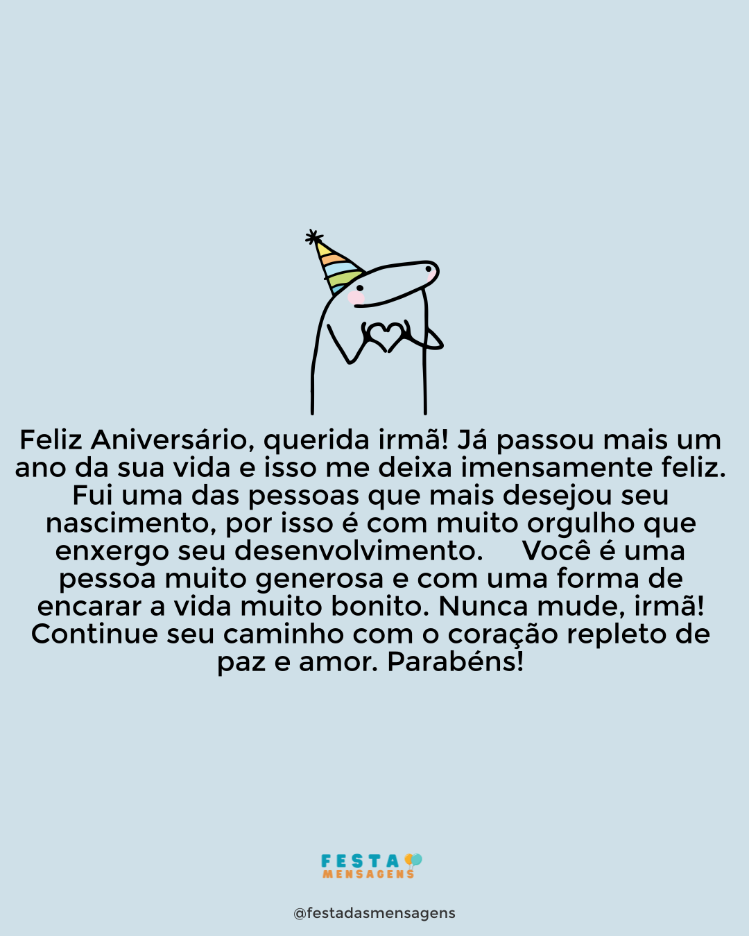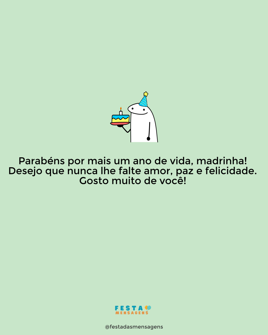 Hoje o dia é todo seu e é com muita alegria que eu venho parabenizá-la! Você é muito especial para mim, pois além de ser minha querida prima, é também minha comadre amada. Espero que possa aproveitar cada segundo do seu aniversário. Eu sou muito feliz por tê-la na minha vida e espero que saiba que pode contar comigo para tudo. Estarei sempre ao seu lado para tudo que precisar. Que seu novo ano de vida seja abençoado por Deus e que a fé possa sempre lhe acompanhar. Desejo a você um aniversário de paz, amor e muita alegria, prima. Felicidades!