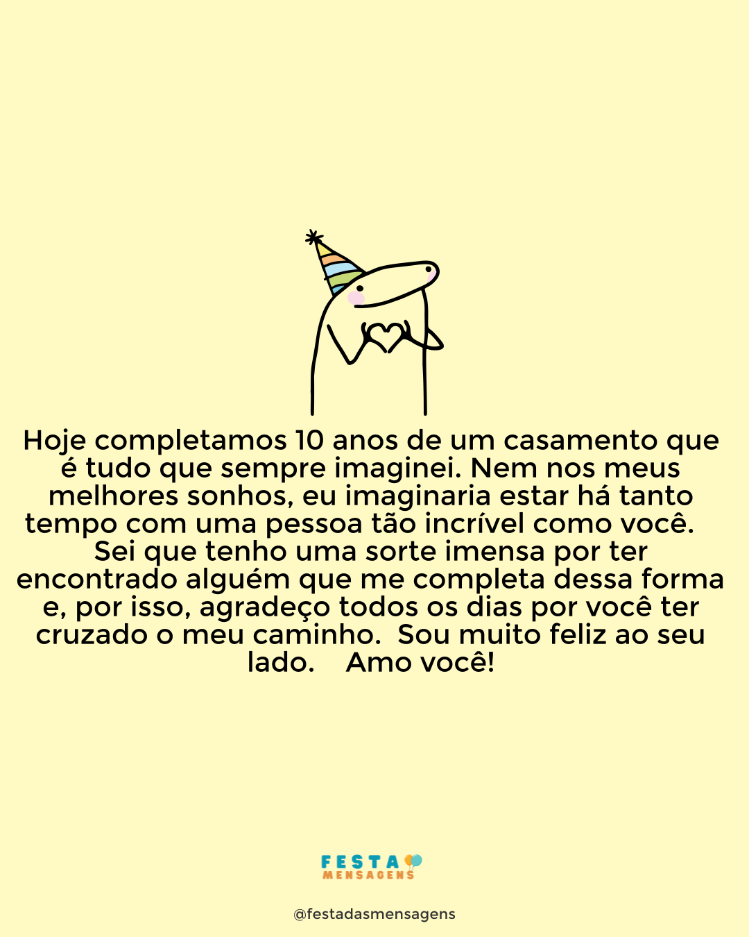 Meu amor, chegamos às nossas bodas de latão. Feliz aniversário de casamento! Costumam falar que aos sete anos o relacionamento entra em crise, mas eu sinto que não poderia estar mais feliz. Tem sido uma aventura fantástica, viver a vida com você ao meu lado. Melhor companhia não há, melhor amor jamais existiu. Amo você, muito mesmo, e apenas desejo que seja tão feliz quanto eu sou ao seu lado; e que cheguemos juntos ao final das nossas vidas, bem velhinhos!