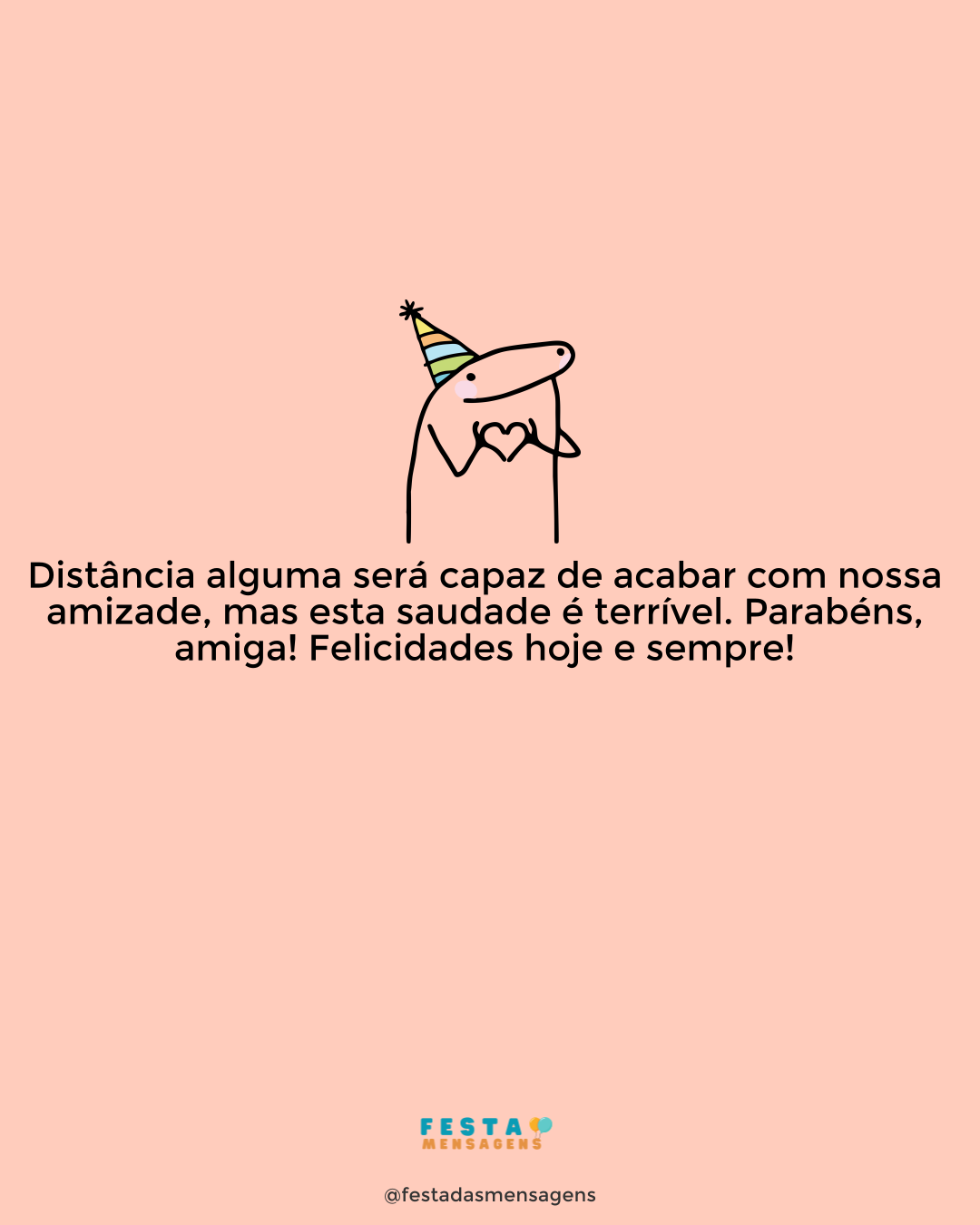 Meu melhor amigo, você é Uma pessoa muito especial para mim. Neste dia tão especial, quero lhe Dizer o quanto você representa para mim. Um amigo nos faz sorrir e nos encoraja Para sermos bem-sucedidos. Ele empresta um ouvido quando precisamos, Ele compartilha uma palavra de elogio e Sempre tem coração aberto para nós. Ele divide conosco aquilo que tem E se sente feliz com o que pode receber. Amigo é assim como você. Saiba que você faz o papel certinho de um amigo. Obrigada por tudo! E hoje quero lhe desejar tudo de bom que Há neste mundo, pois você merece tudo Isso em dobro. Conte comigo, sou sua amiga e estou ao Seu lado. Parabéns, muitas felicidades!
