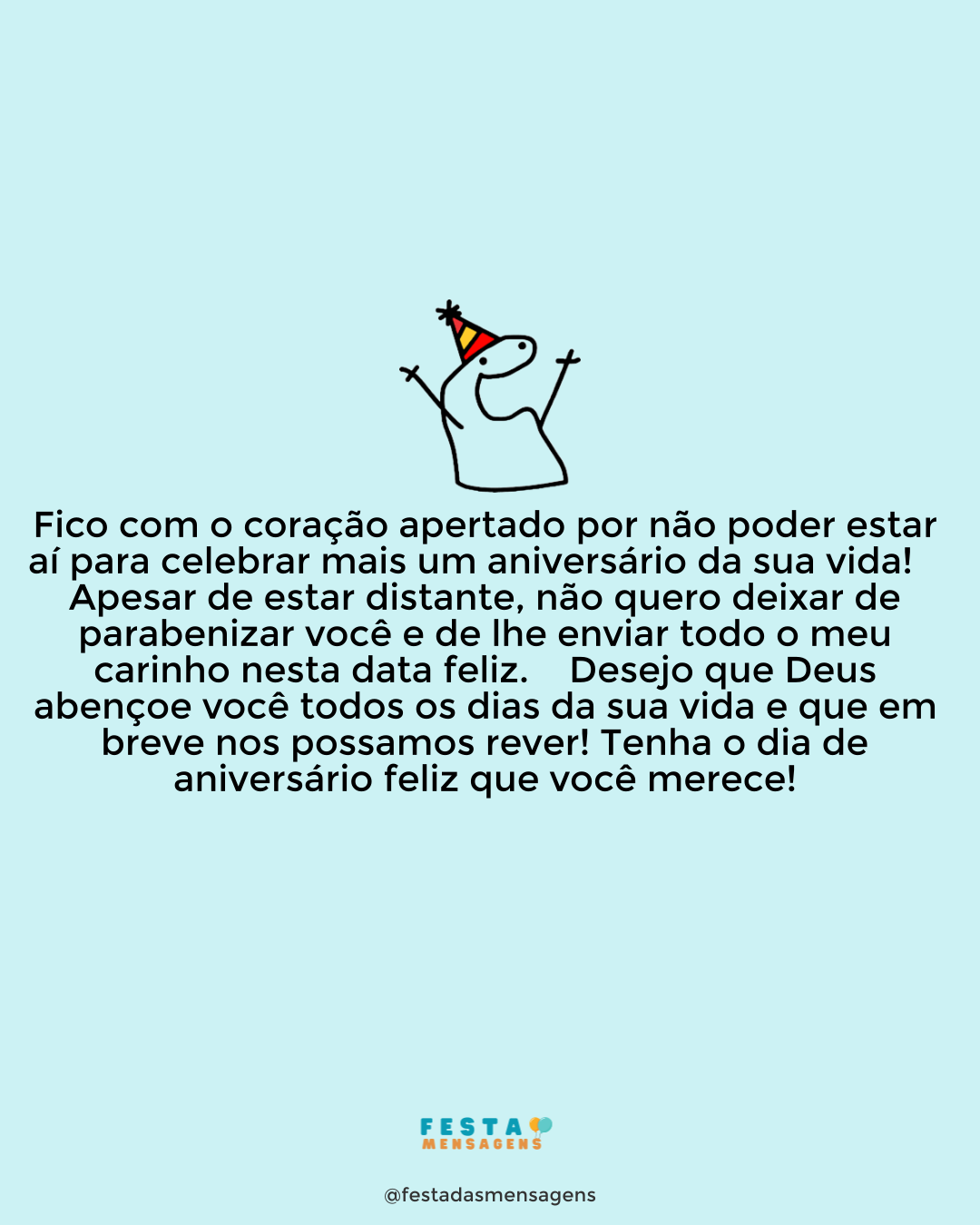 Querida madrinha, é verdadeiramente incrível que, apesar de estarmos separados por tantos quilômetros, continuemos a ser tão próximos e a nos dar tão bem. No seu dia especial, eu adoraria estar aí do seu lado para lhe dar um abraço forte e cheio de emoção, mas infelizmente terá que ficar para outra altura. Espero que se divirta muito e que tenha um dia maravilhoso e mágico! Parabéns, madrinha!