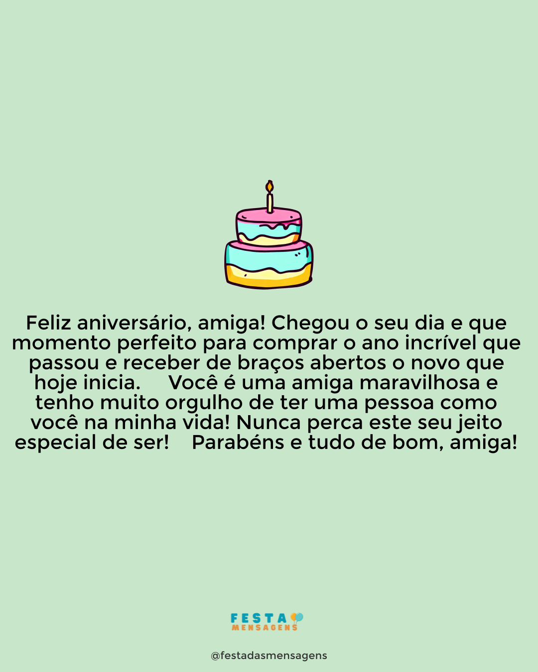Você sabe que nos conhecemos faz pouco tempo, mas o sentimento que nos une é gigante, amiga. Hoje você está de parabéns por conquistar mais um ano de vida. Tenha um aniversário muito feliz! Desejo que tudo na sua vida dê certo. Que seus sonhos se realizem e que a felicidade faça sempre parte do seu dia a dia. Você é uma amiga incrível, dona de um coração de ouro e muito, muito interessante. Curta esta data ao lado dos amigos e familiares, das pessoas que verdadeiramente importam. Eu estarei junto, é claro, para testemunhar o brilho de alegria e felicidade no seu olhar. Parabéns, querida!