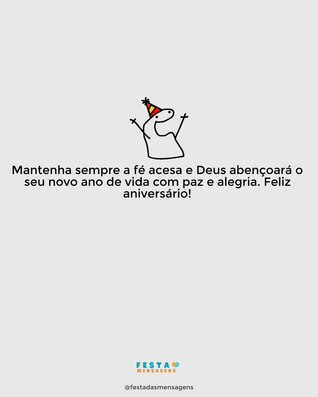Parabéns pela conquista de mais um ano! Gostaria de encorajar você a continuar perseverando no caminho de Deus, buscando a Sua vontade para a sua vida! Lembre que estamos rodeados por espíritos que tentam nos desviar dos propósitos do Senhor. Por isso, não se desvie nem para a esquerda, nem para a direita. E não tema, porque Deus estará sempre com você! Seja constantemente guiado pela verdade da Bíblia, e peça sabedoria ao Criador para viver uma vida que O glorifica. Que os seus olhos espirituais sejam abertos, para que você possa conhecer mais e mais a Jesus! Um abraço fraternal!